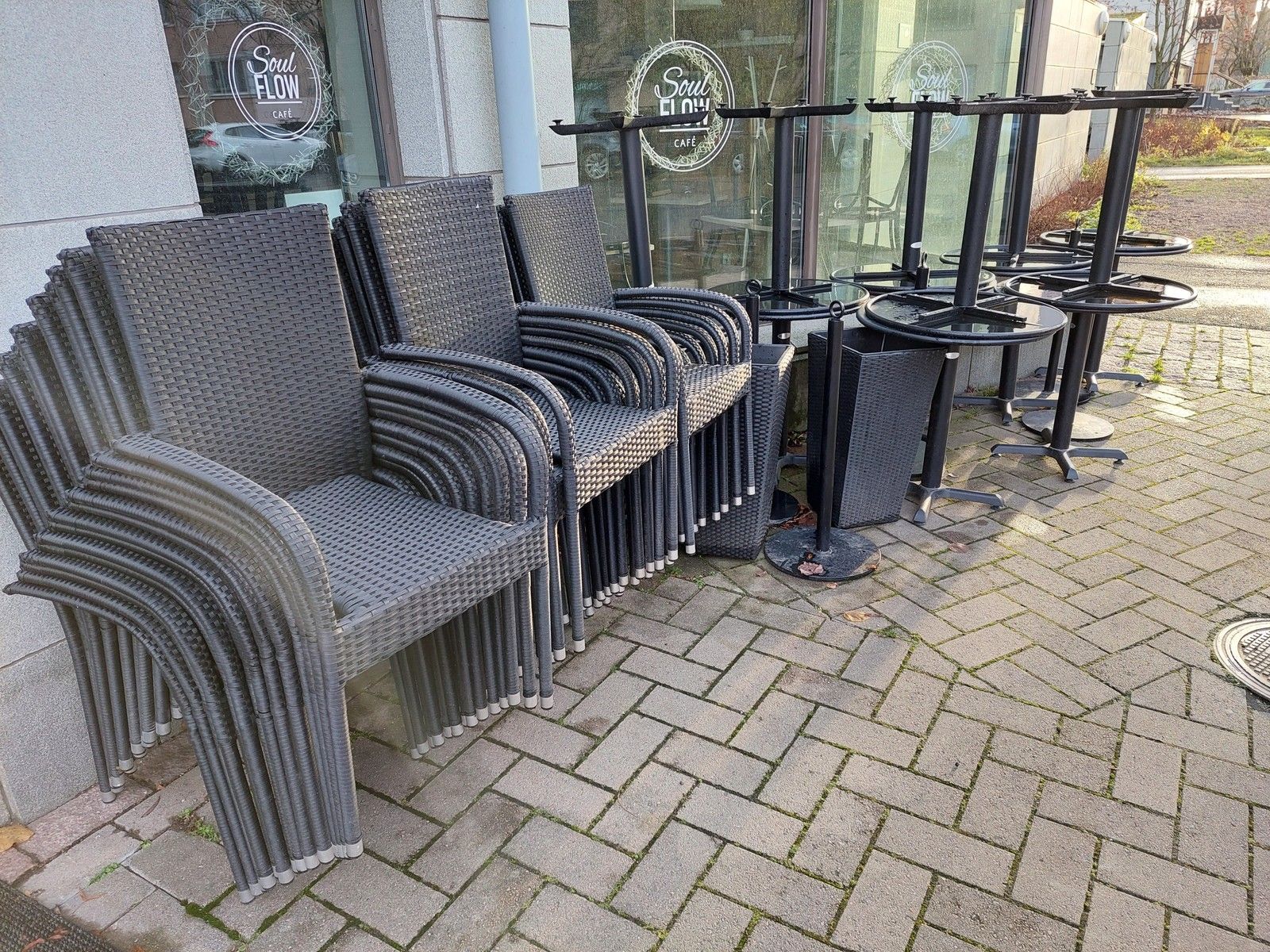 Erä hyvä kuntoisia ulkokalusteita (40kpl tuolit, 15kpl pöydät ja 3kpl kukkaruukut). Soul flow coffee oy konkurssipesä, Helsinki