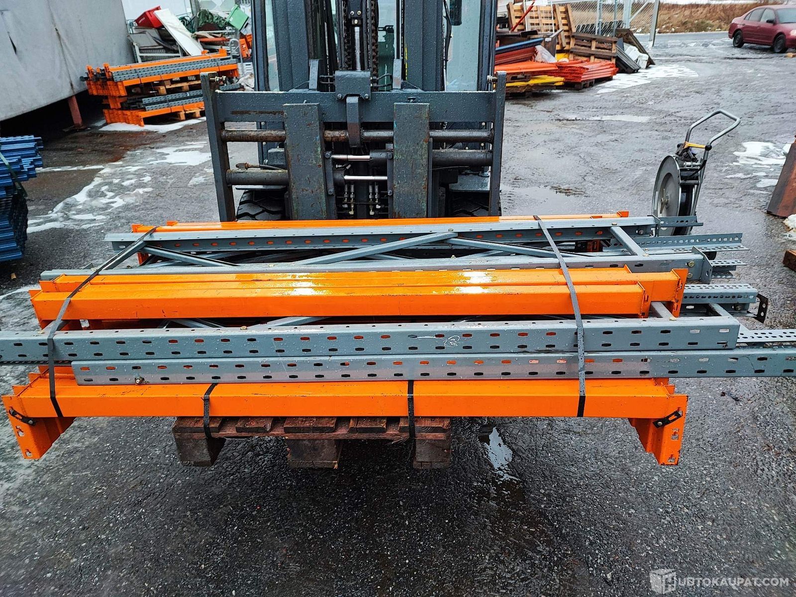 TOIMITETTUNA: N. 19.4m pitkä DEXION Trukkihylly / Kuormalavahylly. Tilat jopa 46:lle lavalle! Rengasliikkeen käyttöön rakennettua 450mm Syvää VARASTOHYLLYÄ, Lieto