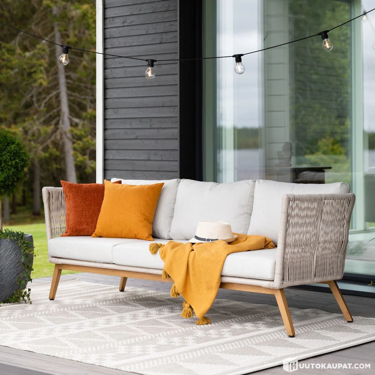 Loiste is a beautiful 3-seater poly rattan sofa with sand-coloured cushions. The stylish whole is created by the attractive-coloured weave, plush cushions and elegant legs. The sofa frame and legs are durable aluminium with a wood-effect finish. The sofa is comfortable yet firm to sit on. Cushion covers are weather-resistant and removable. The cushions are not waterproof and should be protected from rain.