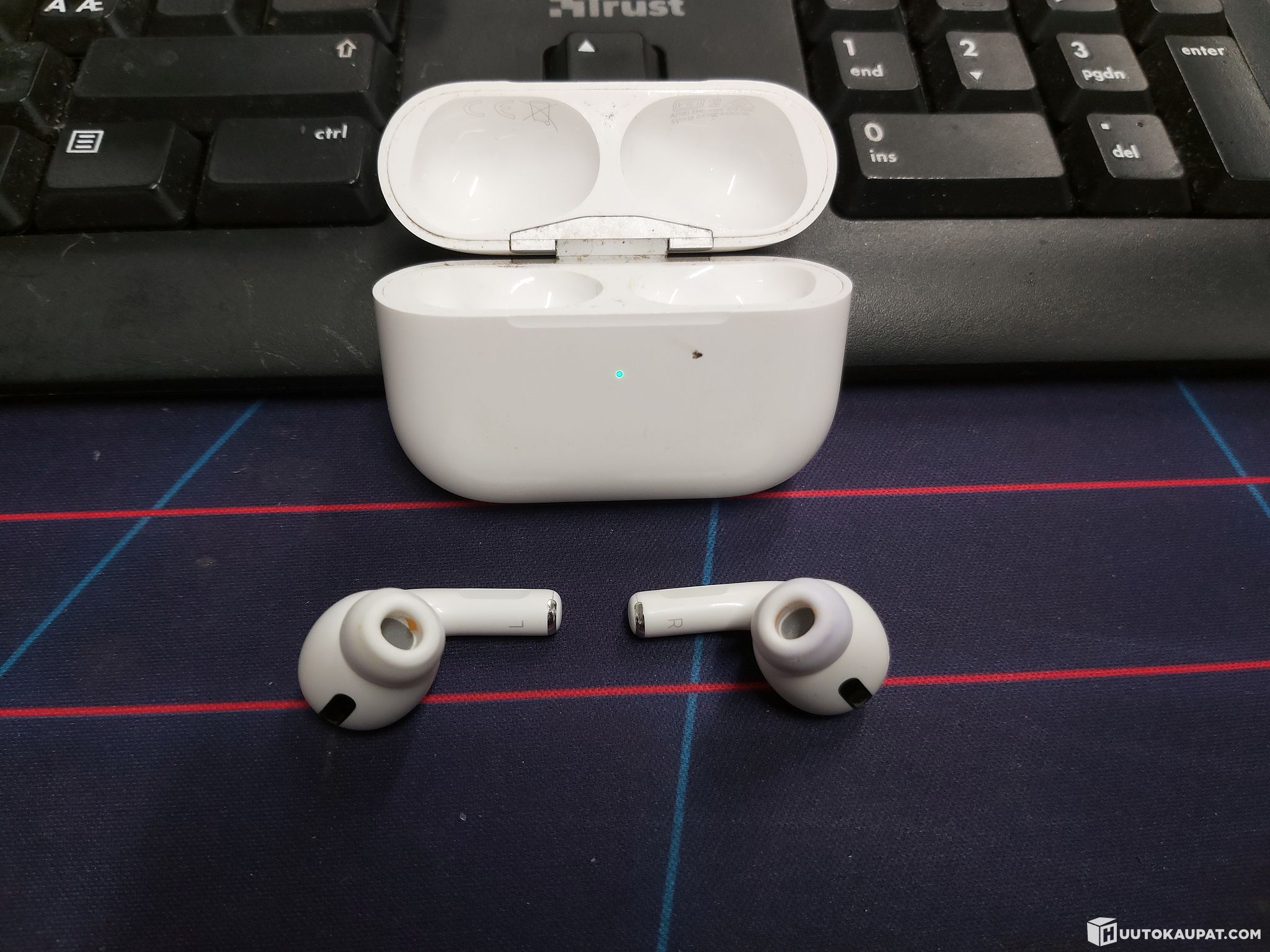 Used. Includes earbuds, charging case and charger. Ear tips size S