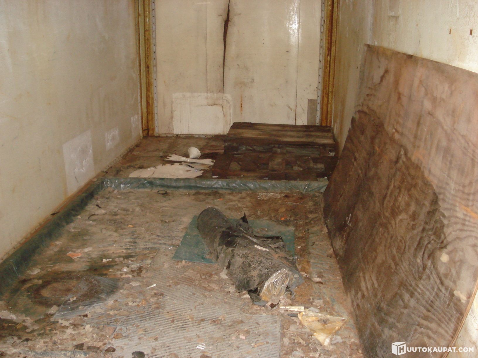 The frame appears usable externally, but the walls and roof are in poor condition