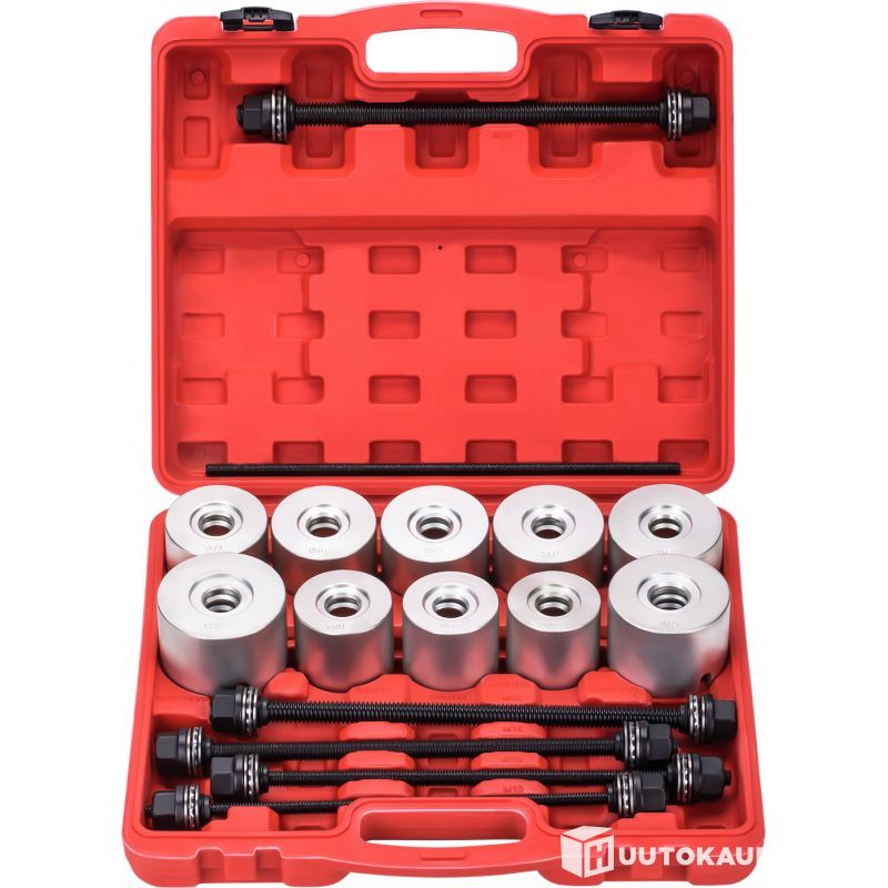 This is a professional set designed for fitting and removing bearings and bushings in vehicle suspension systems. This complete set simplifies workshop tasks and ensures fast and precise maintenance operations.