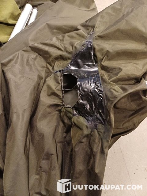 A melted hole in the rear wall caused by misuse. See photos. — not used for sauna since. Still produces steam but can possibly be repaired with an adhesive patch or by sewing a piece of new fabric.