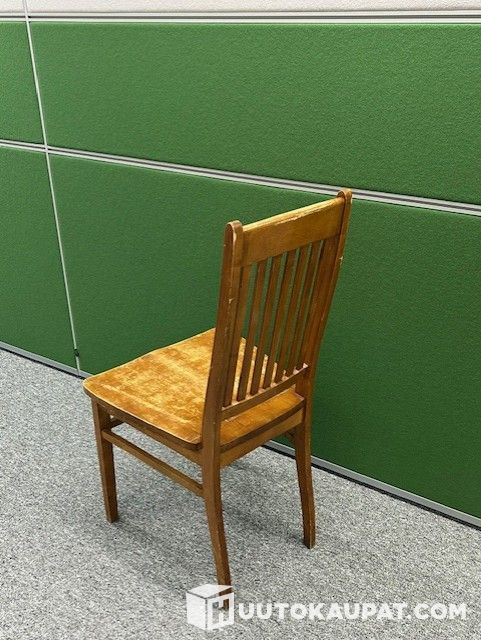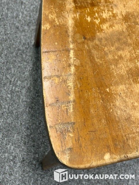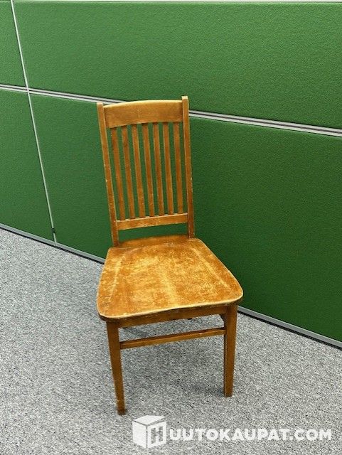 The chair's varnish is worn through in many places. Deep marks on the seat are clearly visible in the photos.