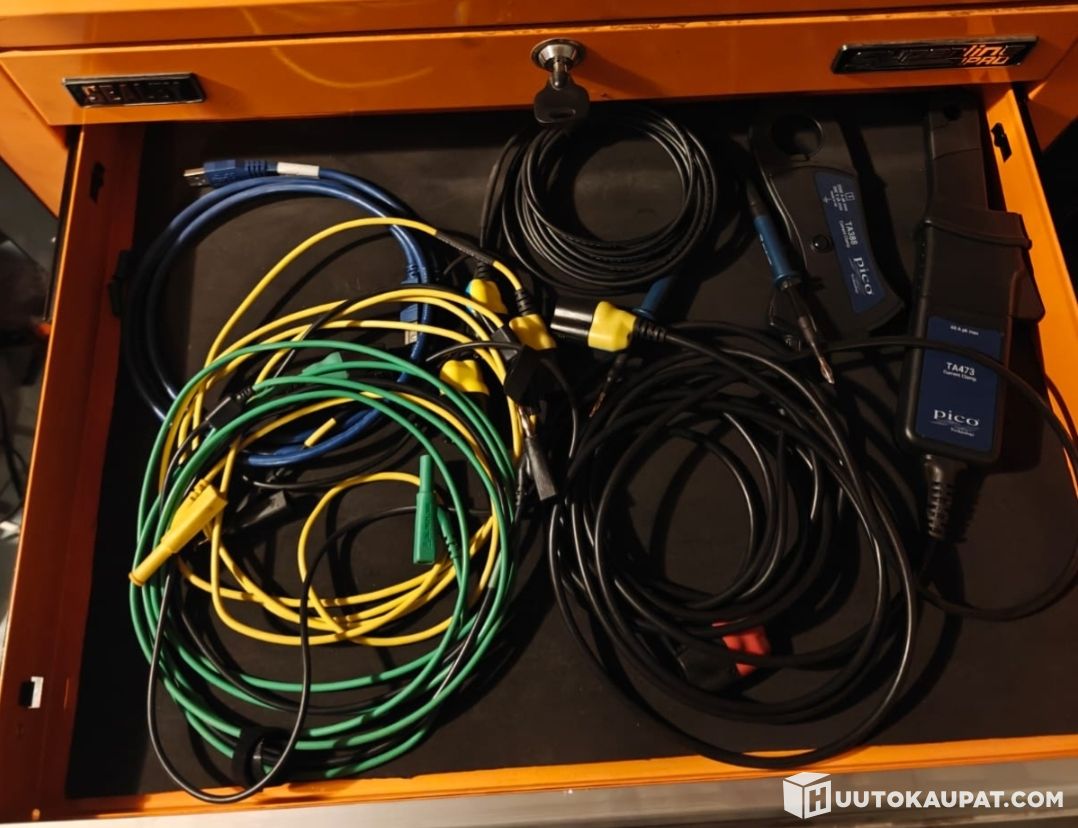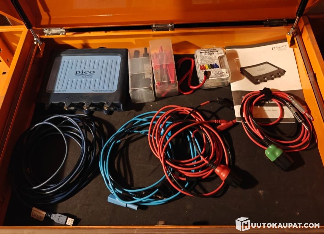 4-channel digital oscilloscope for automotive electrical and electronics measurements and engine testing. Connects to a computer via USB. Supplied for measuring primary voltages and includes 20/60 A and 2000 A current clamps. Finnish-language software and a wide range of leads and probes.