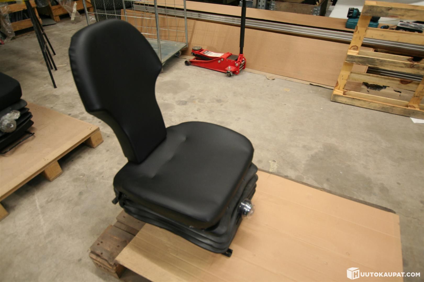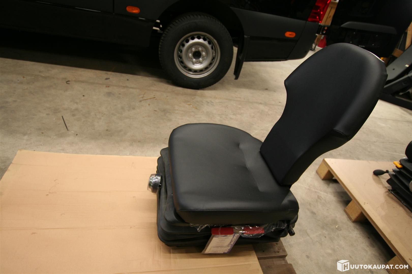 Work machine seat, upholstery black faux leather. Suspension and weight-adjustable. Seat with sliding rails.