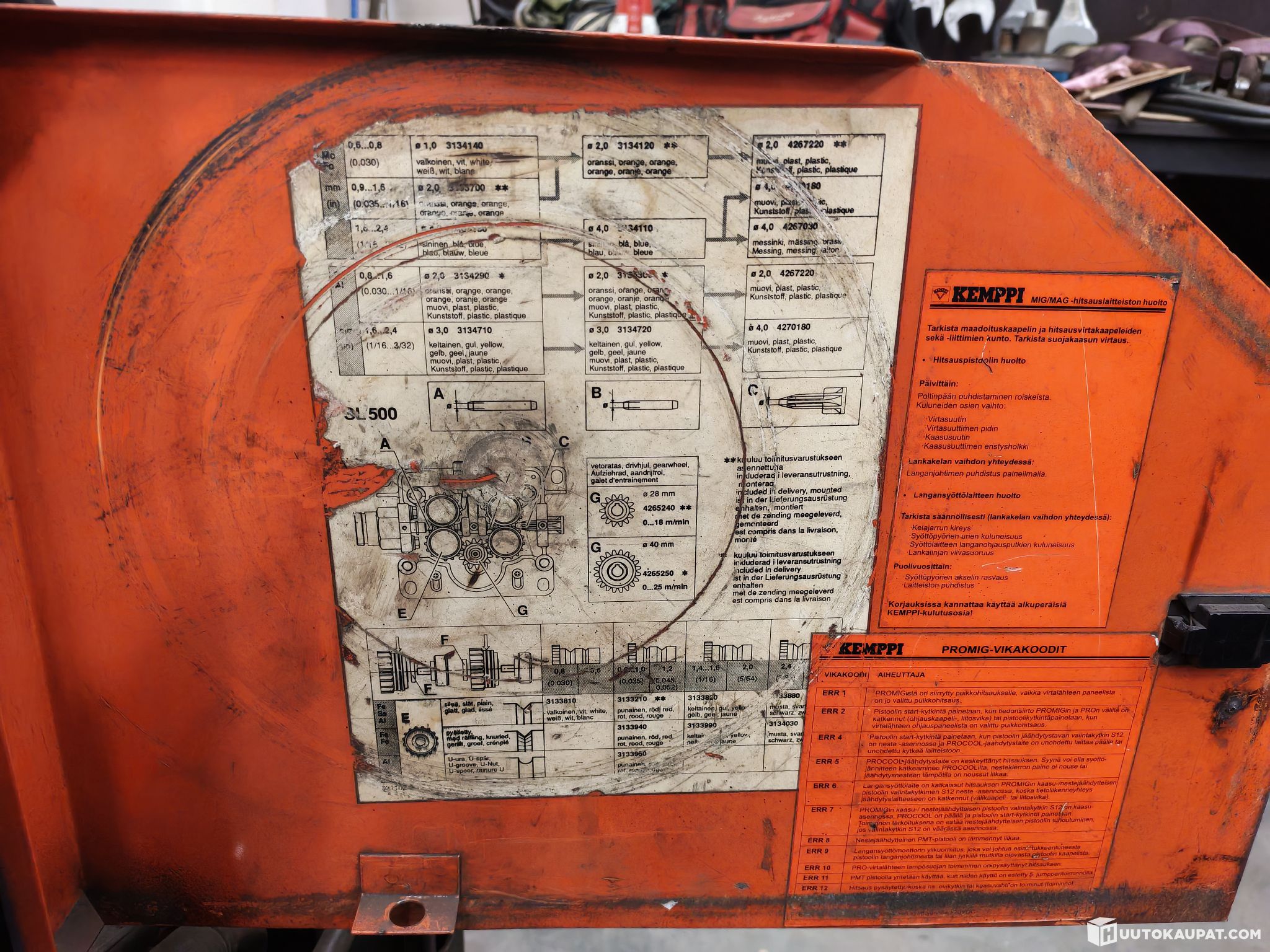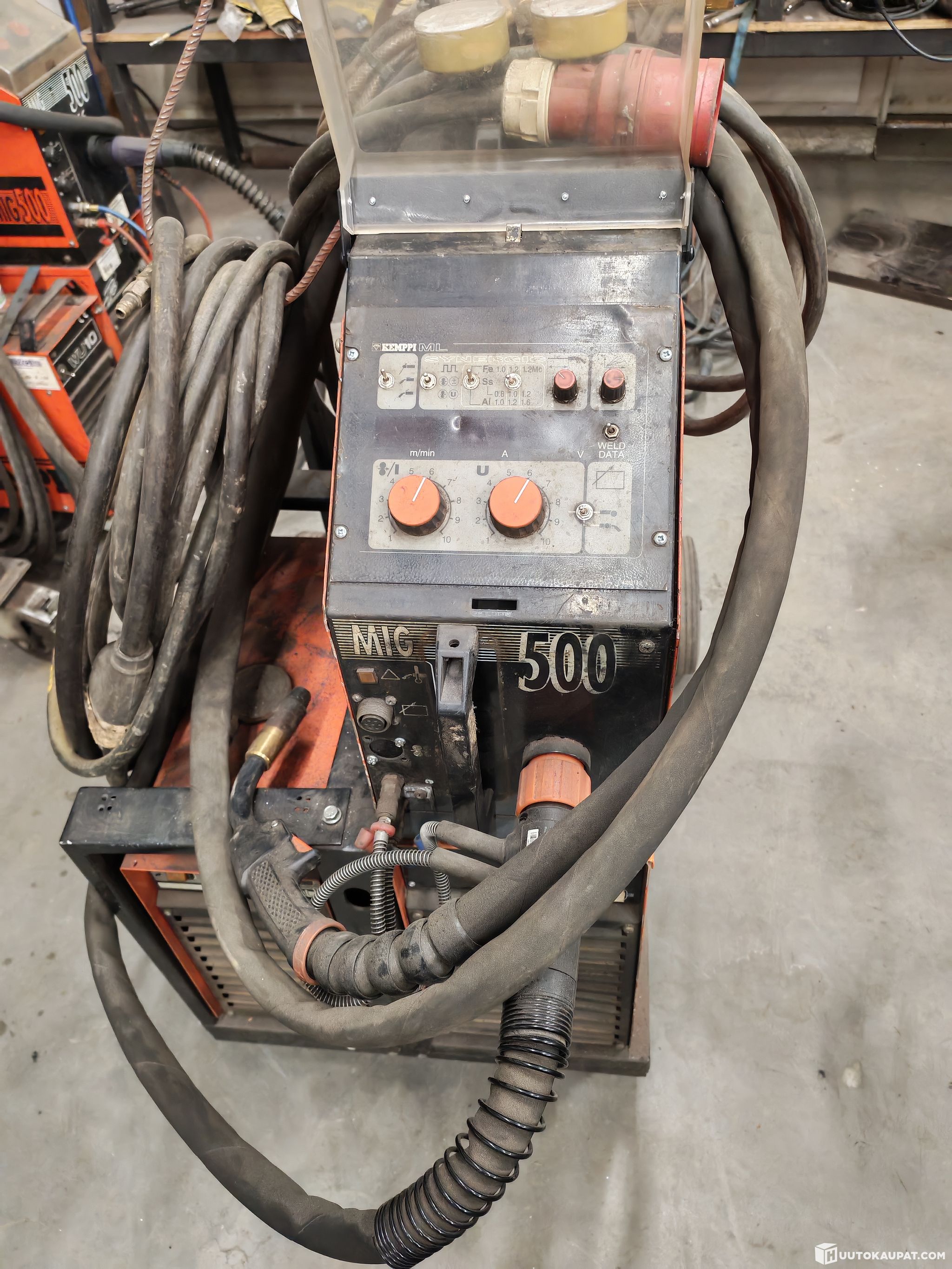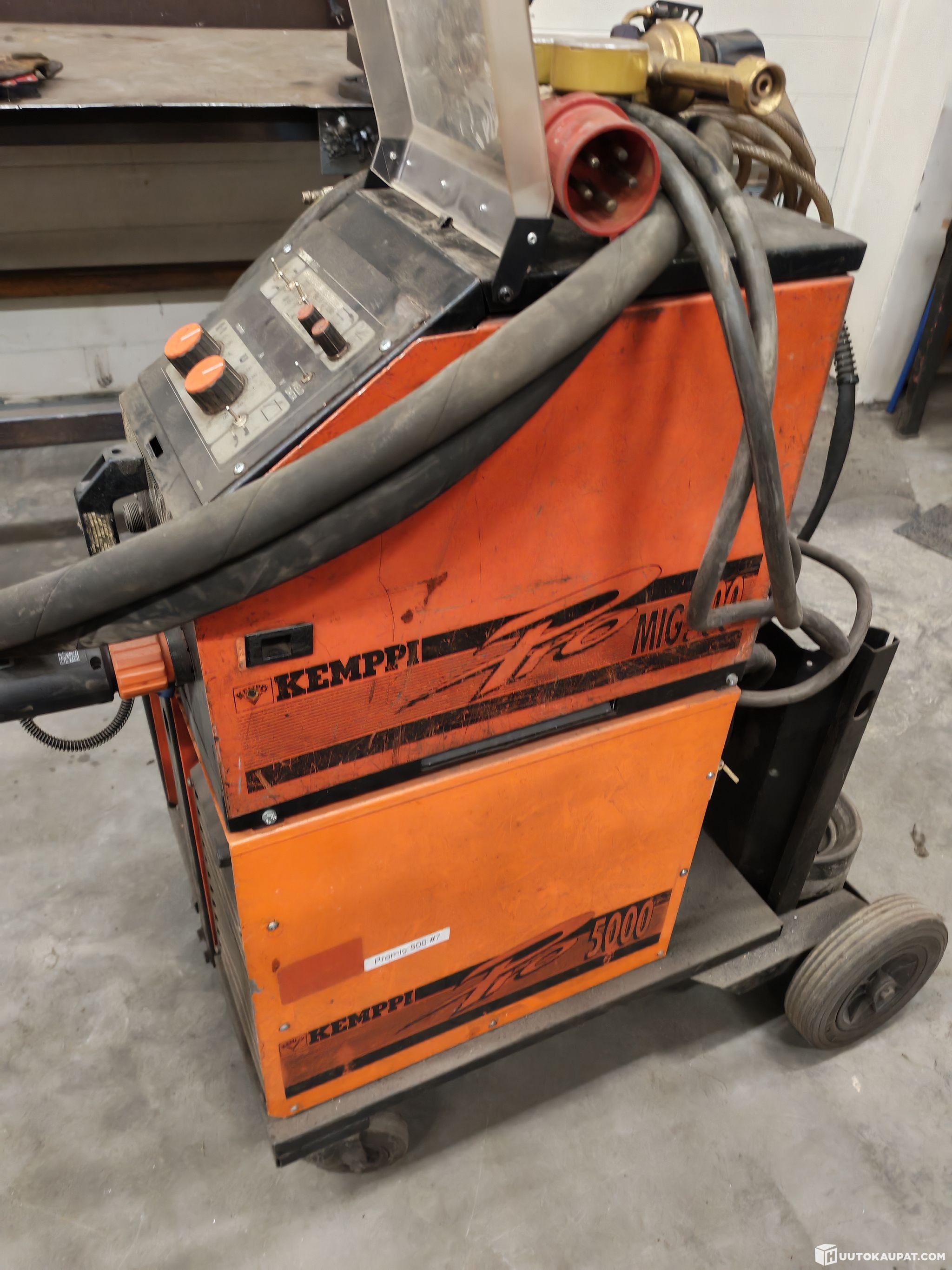 Kemppi 500 A pulsed MIG, can also weld aluminium and includes a carbonising torch cable.
