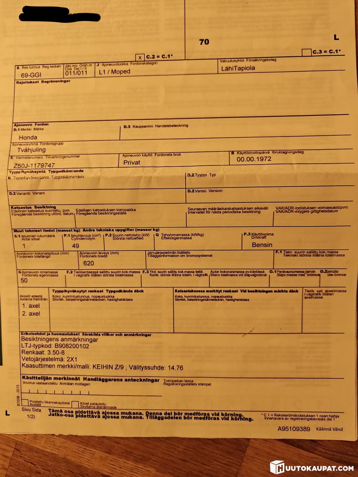 The vehicle must be collected within 7 days of the auction ending unless otherwise agreed - Huutokaupat.com.