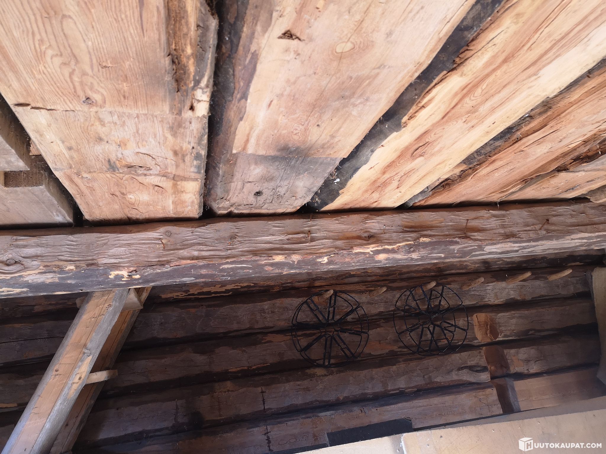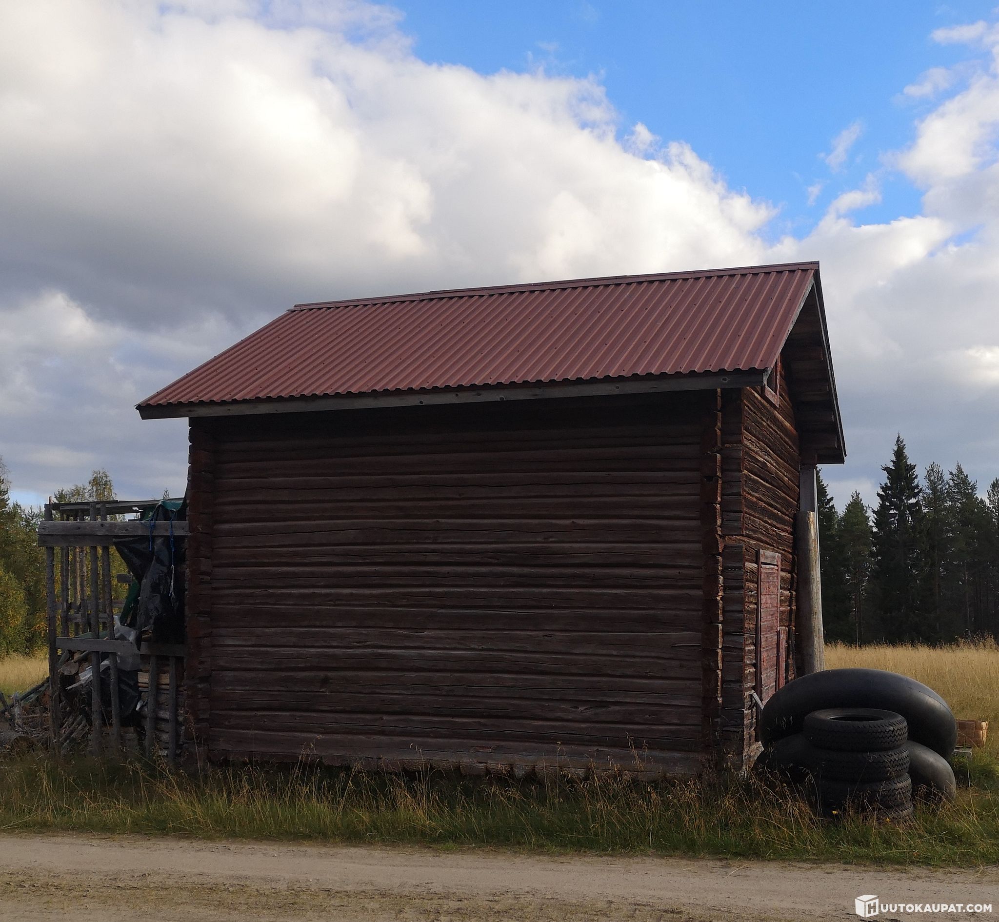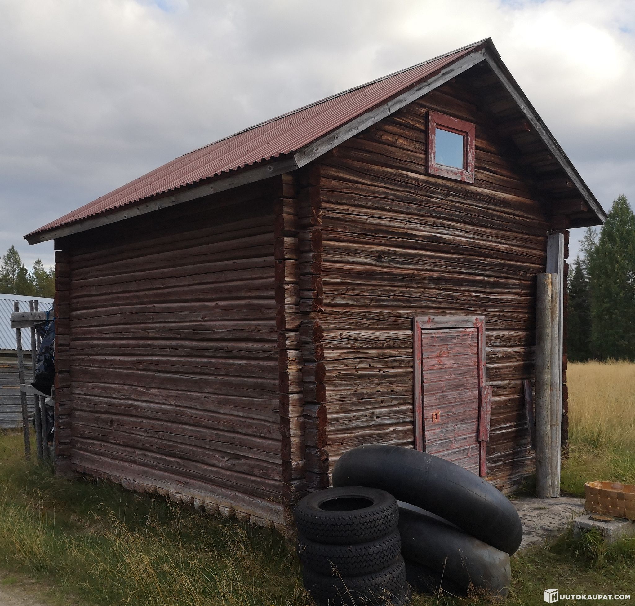 Log storehouse for sale for dismantling. A fine, solidly built old-style storehouse that adds an idyllic rural atmosphere to a yard. The storehouse can be adapted as desired to suit your needs — for example as a sauna or a sleeping cabin. Easily dismantled/loaded; located beside the driveway. Made from durable Lapland timber. Dimensions approx. 4 m × 5 m. No rot. The storehouse was cleaned after the photos were taken.