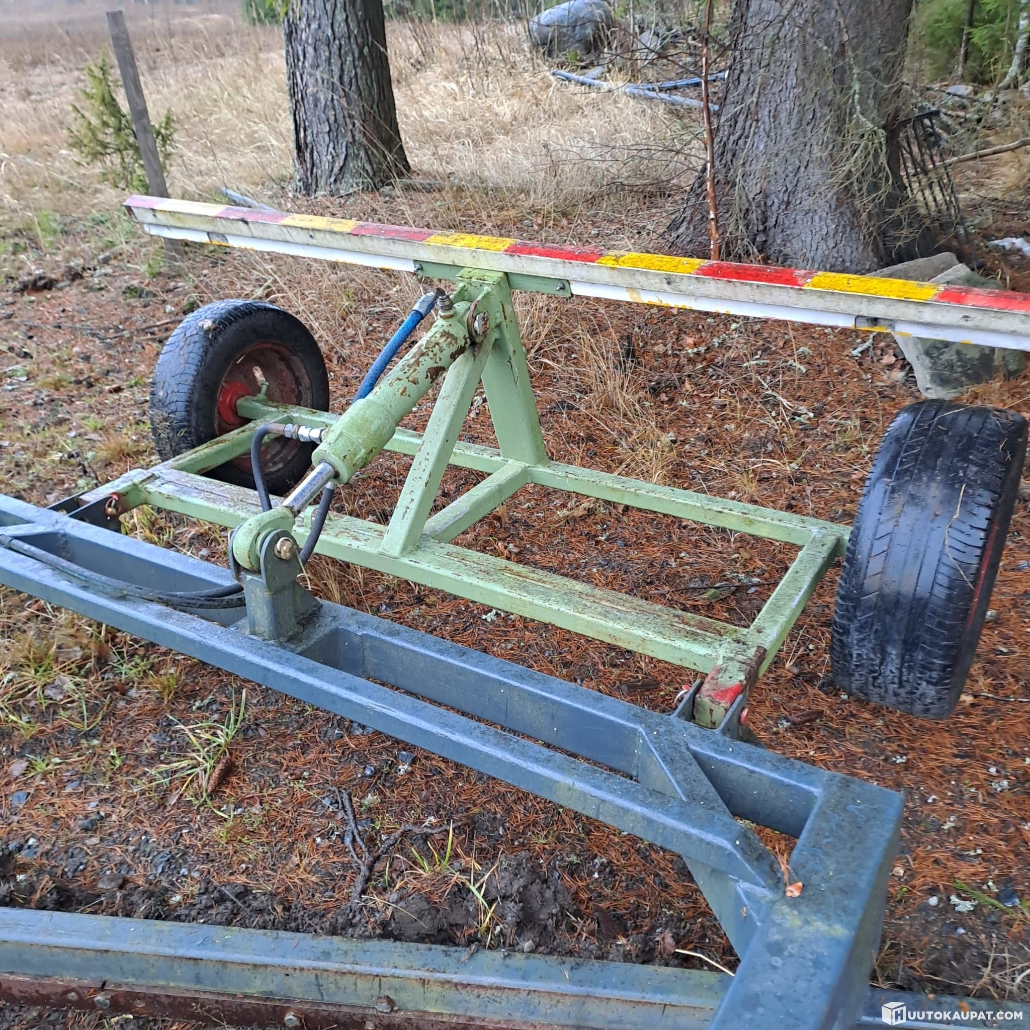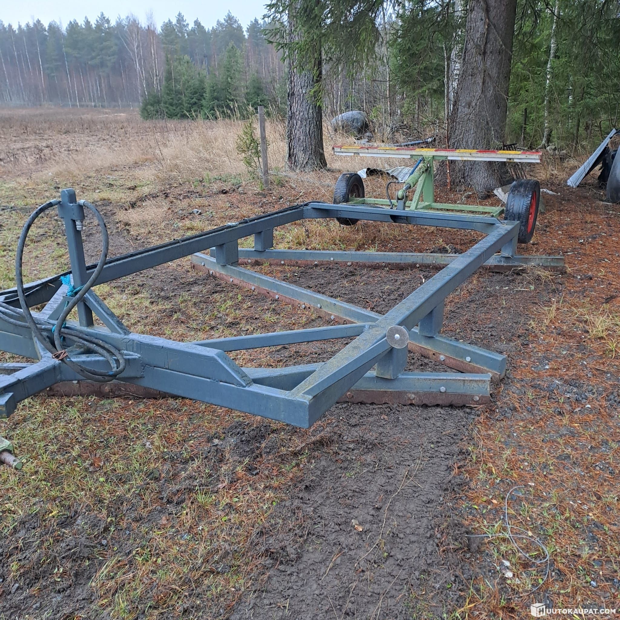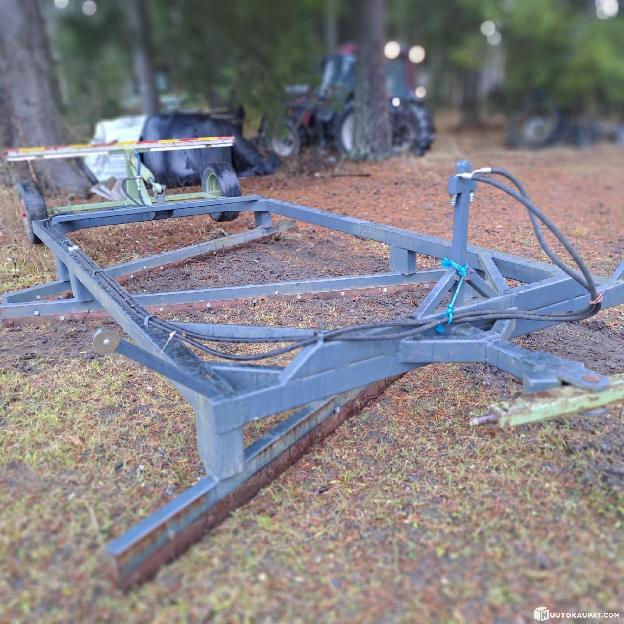 Homemade road grader to be pulled by a tractor. Attaches to the drawbars. Drawbar swivels. Height adjustable hydraulically. Replaceable wear blades. Frame in very good condition. Length 4.2 m and width 2.9 m.