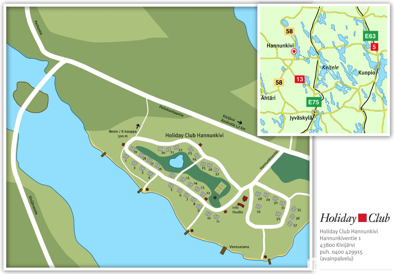 Week-share (week 49) at Hannunkivi holiday village in Kivijärvi. House no. 1, 2 rooms + kitchen + sauna area + loft, approx. 44.0 m². Apartment fully furnished and equipped. Final cleaning and bed linen are included in the housing charge.