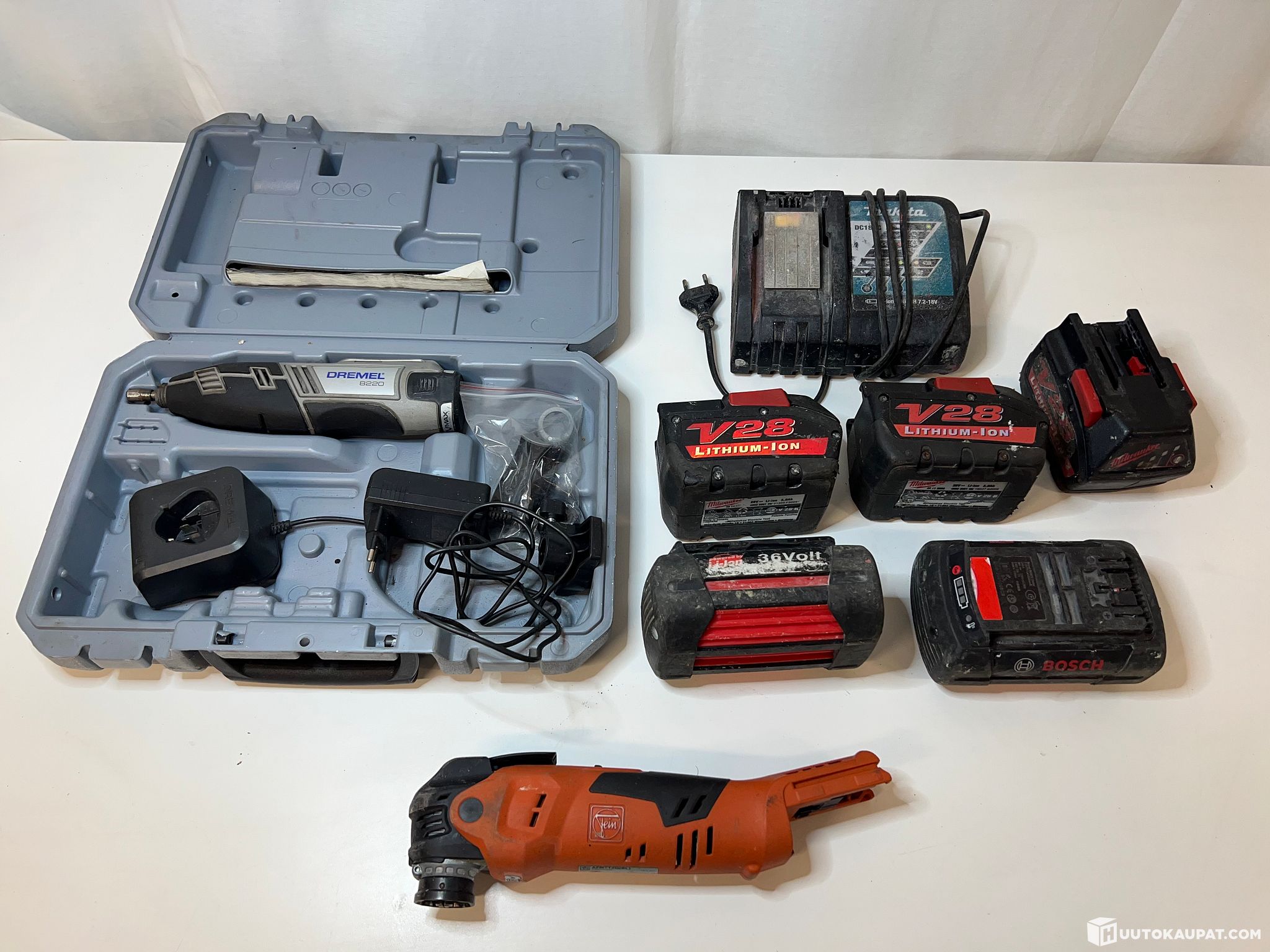 Sold as a single lot: a mixed package of batteries and power-tool housings as shown in the pictures. All are sold for repair / parts, as operation has not been tested and condition is not guaranteed.