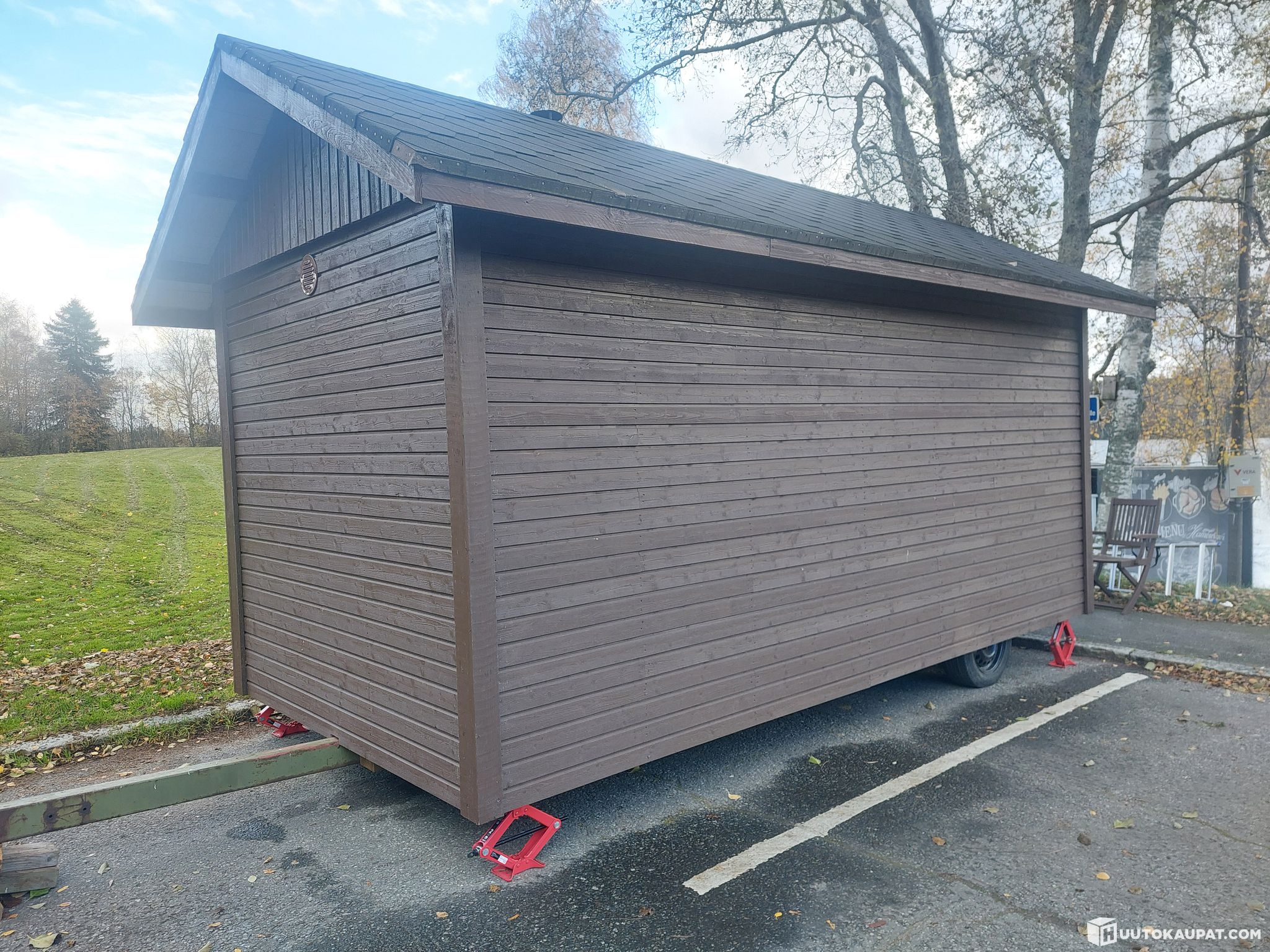 This structure does not require a building permit and can be moved to another location if desired. The trailer has a sturdy, well-maintained base. Support legs are included in the sale, as are the movable items in the sauna.