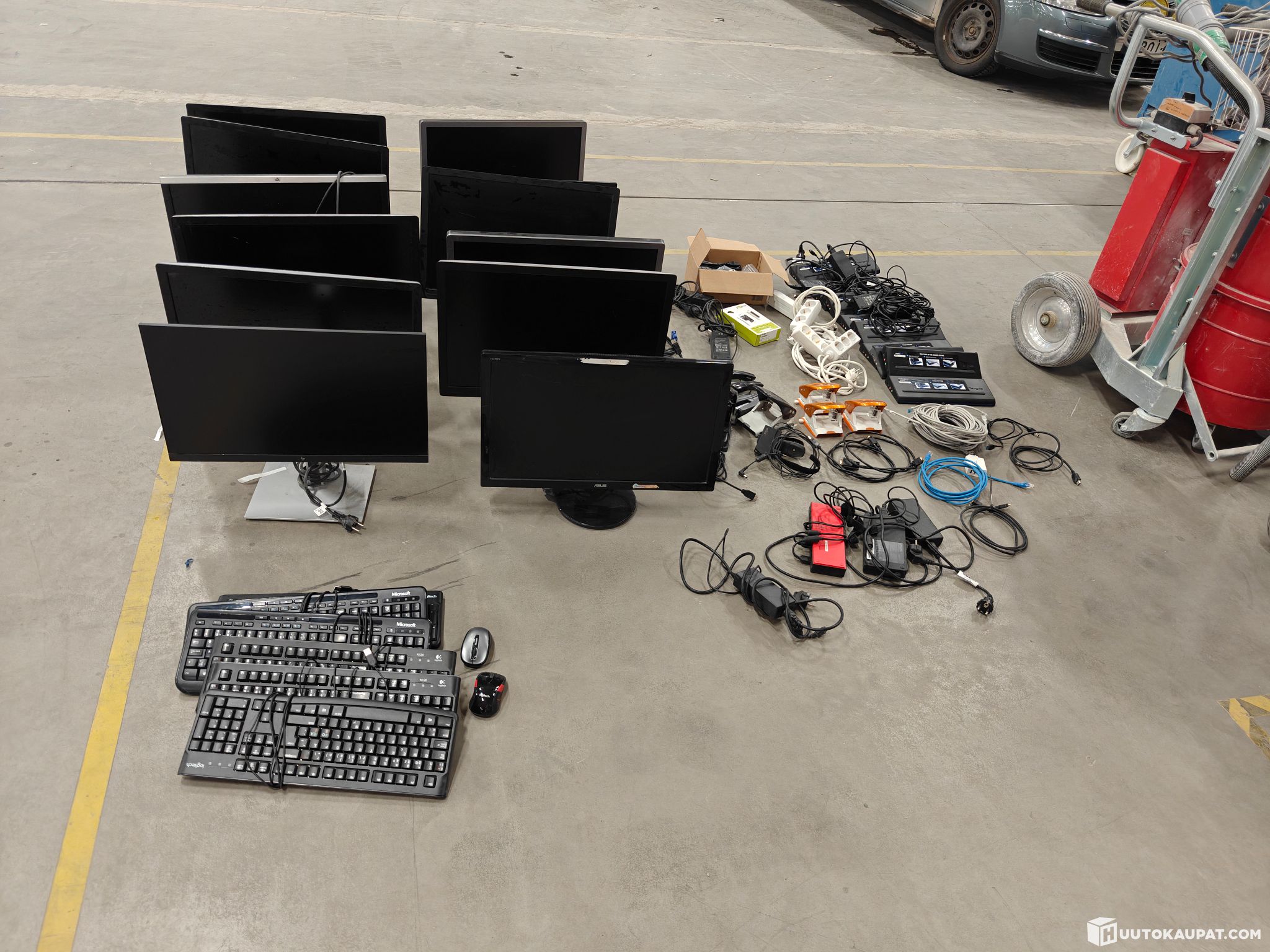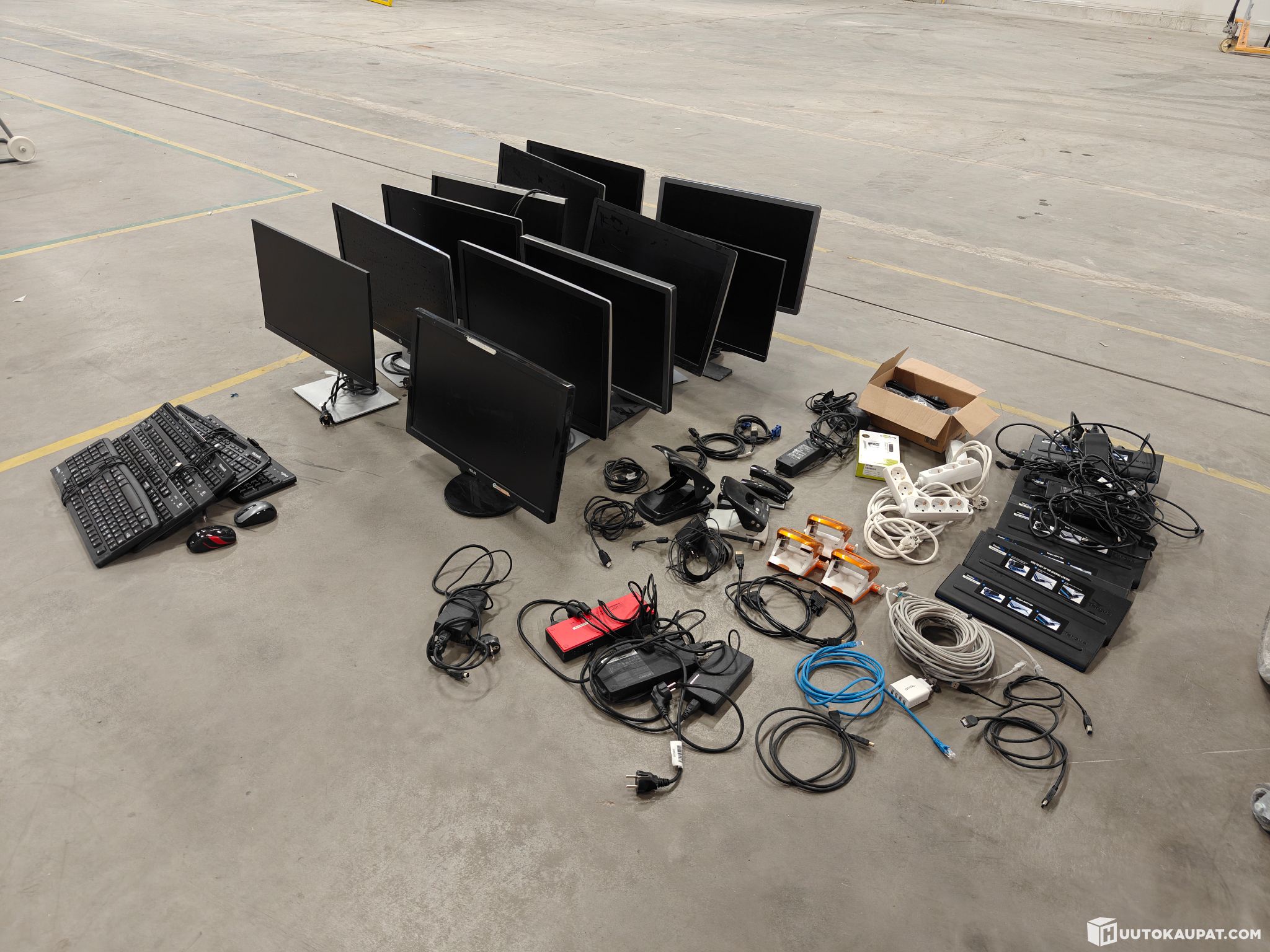 For sale: a lot of computer monitors, docking stations, cables and office supplies as shown in the picture