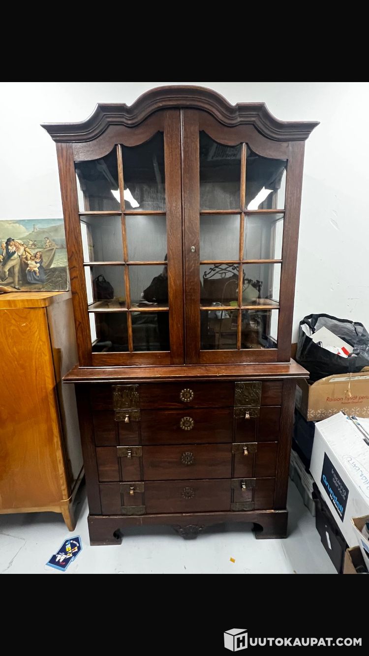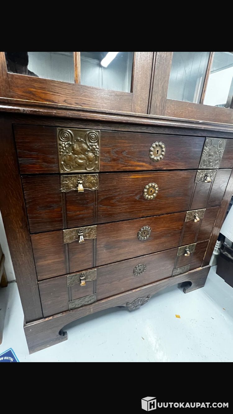 Furniture from a representative home for sale. Very good condition display cabinet. Estimated from the late 19th century. Dark wood with fine metal ornamentation. Key included for the upper display section. Bottom section has drawers. Height 220 cm. Width and depth 116×50 cm. Beautiful and usable!