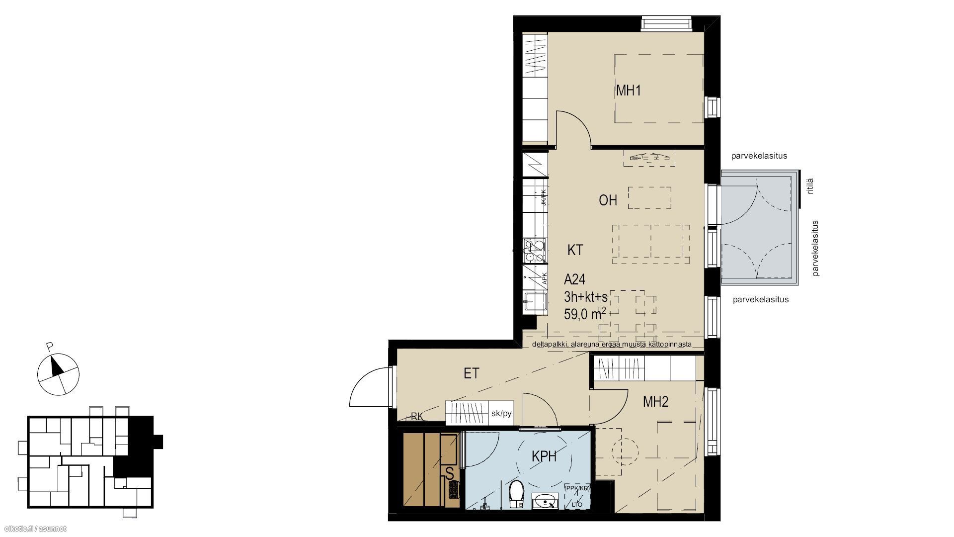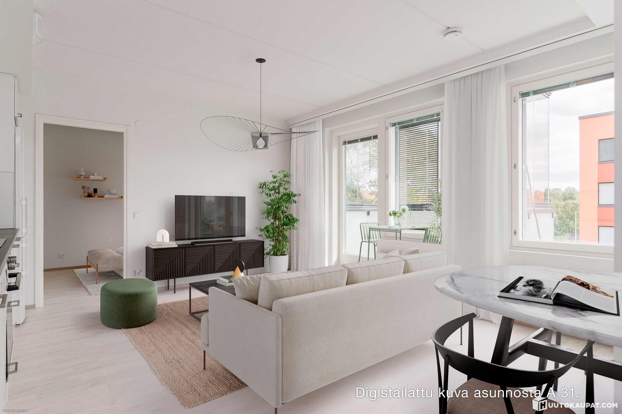 This 59 m² (4th floor of 7) apartment A31 has a practical floor plan, a cosy open-plan kitchen, a spacious bathroom with a sauna, and is located on a pleasant, green corner that can be enjoyed from the glazed balcony. The bedrooms are conveniently on opposite sides of the apartment and there is plenty of storage. The materials are high-quality and timeless, including a Puustelli kitchen and oak parquet.
