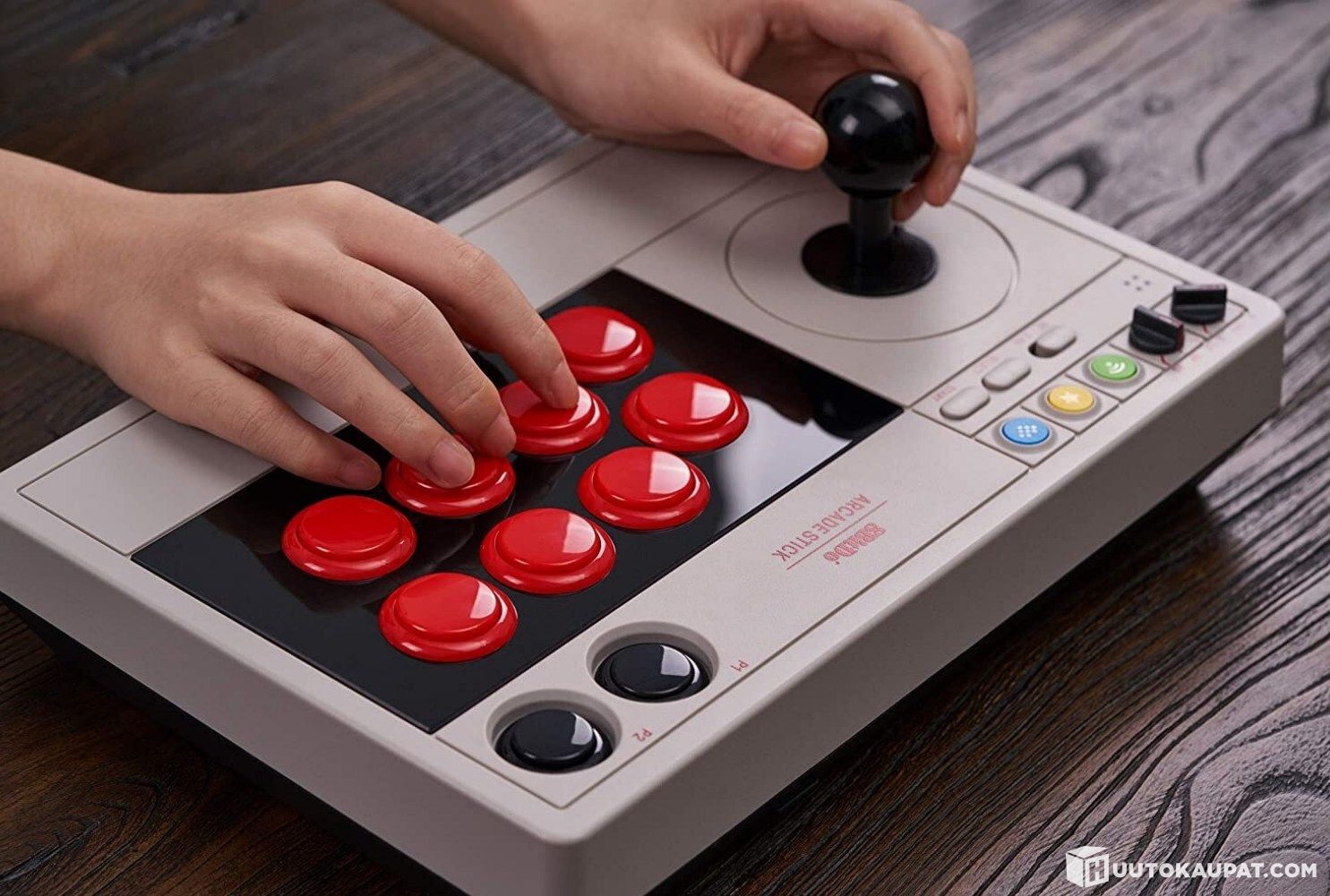 Arcade controller for Nintendo Switch or PC. The controller works wirelessly or wired — the choice is yours. You can also reprogram button assignments and create macros with separate software. The package includes the controller, wireless receiver and a USB-C cable.