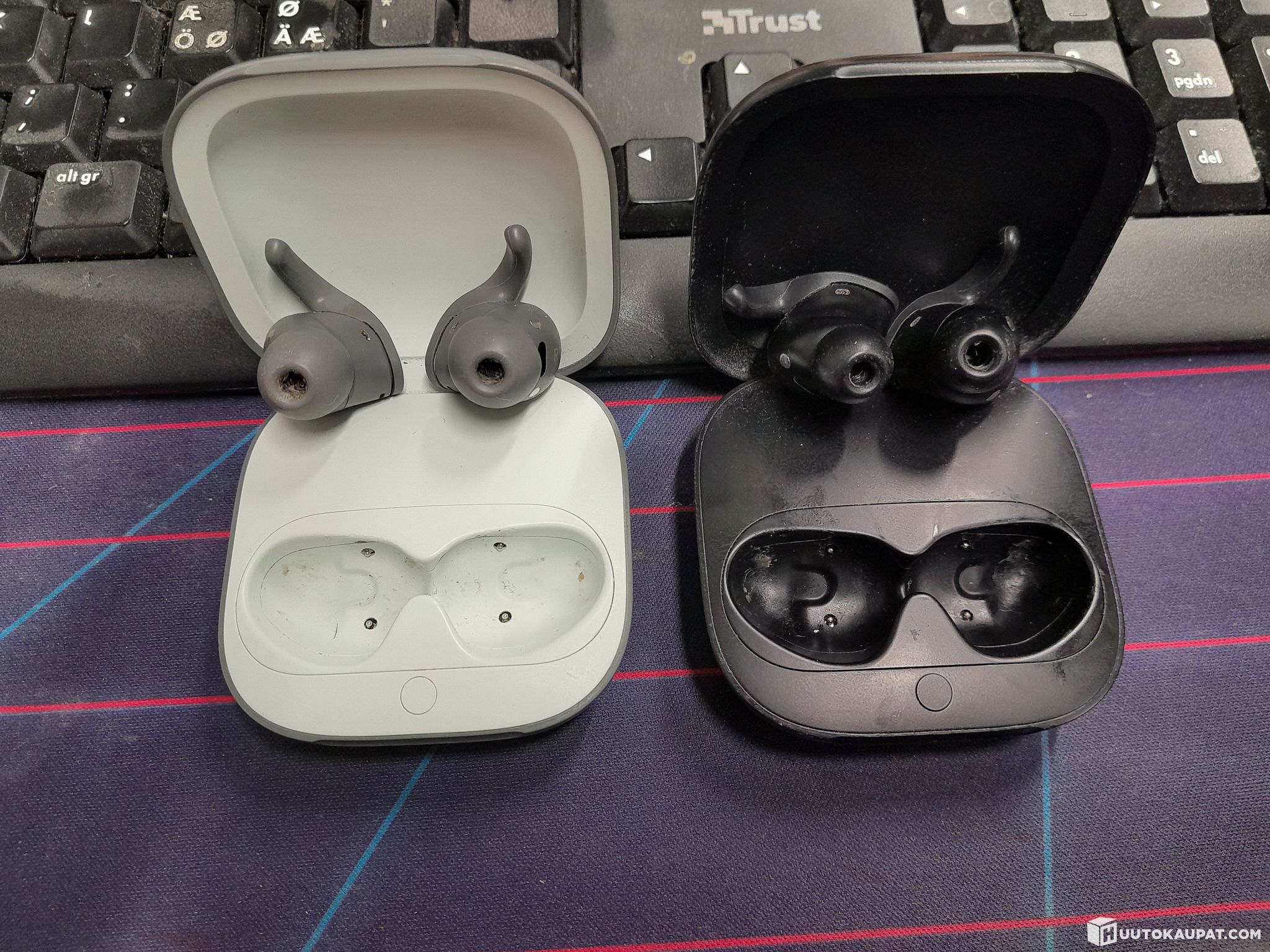 Used. Includes earbuds, charging cases and chargers.