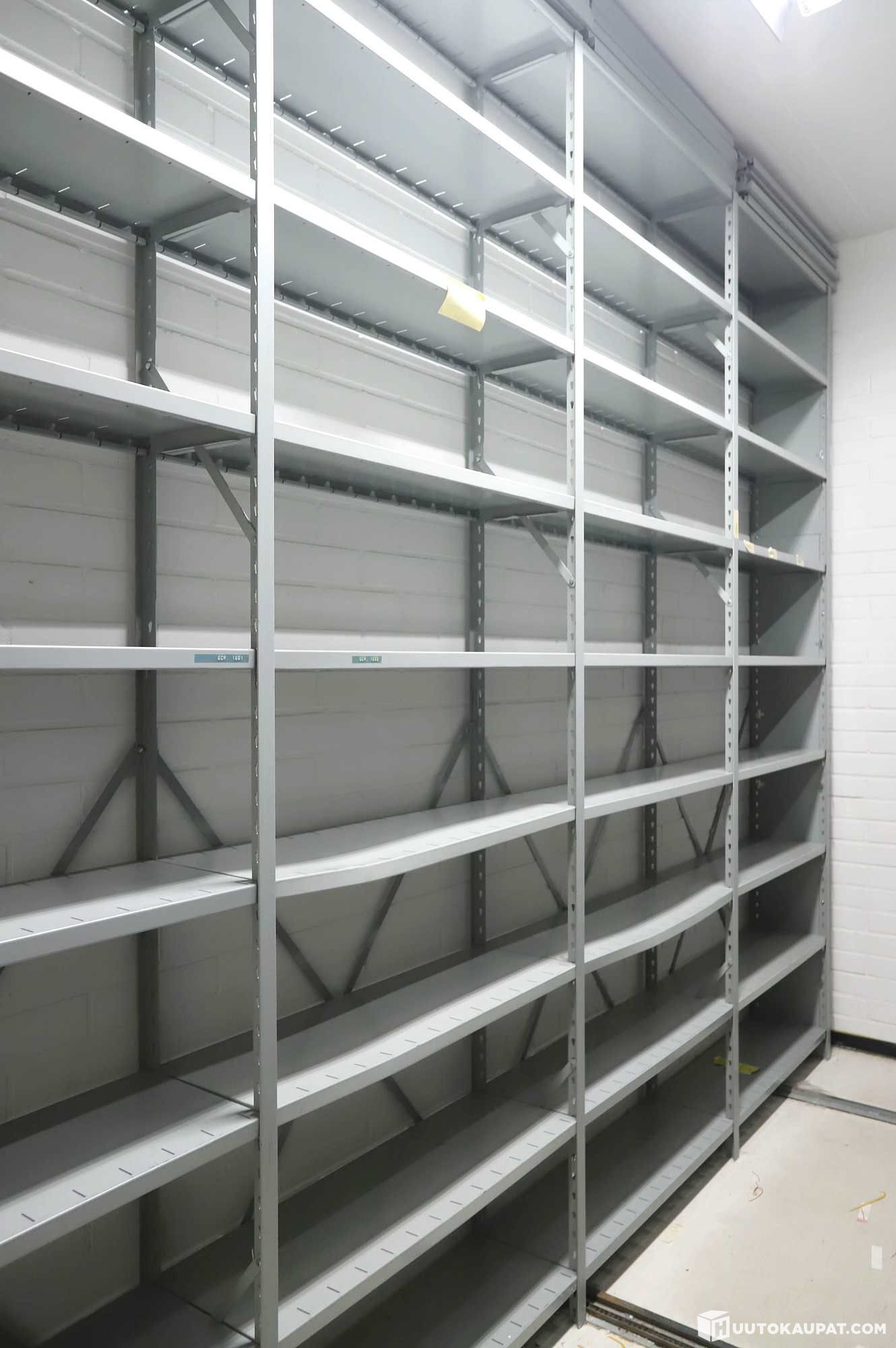 Tall metal shelving unit (5 end frames, 36 shelves).