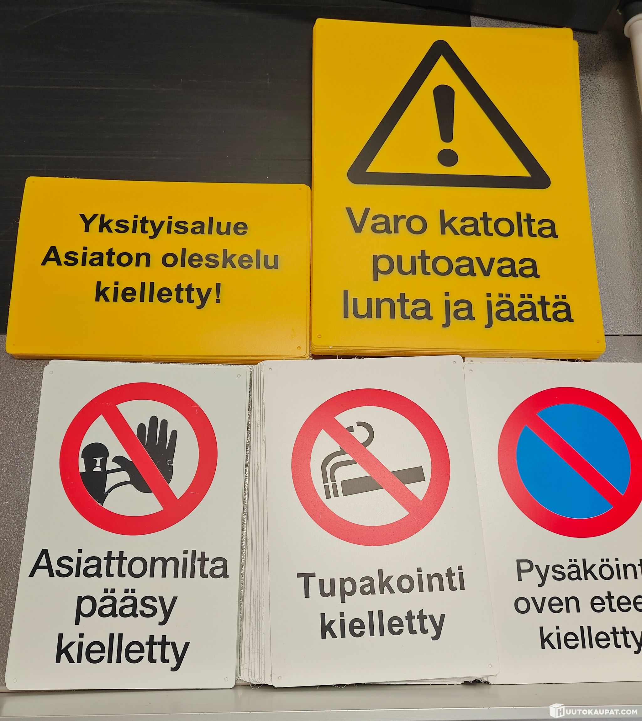 80-piece assortment of plastic warning and information signs. Prices vary €3.90–€4.90 each