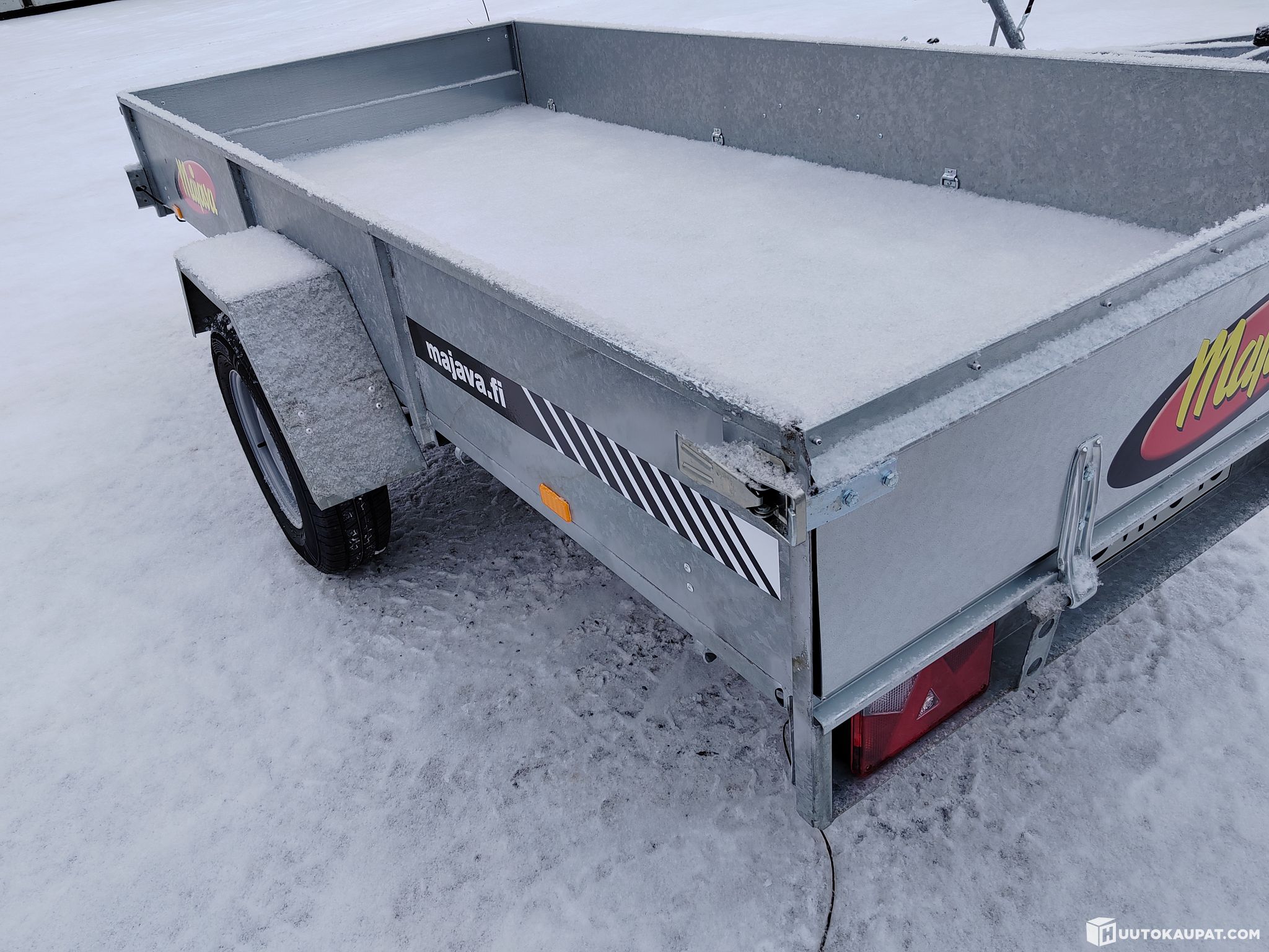 The trailer is made of SSAB steel. The floor plywood is 9 mm birch (100%) with a phenolic anti-slip surface. The edges of the plywood are also sealed to prevent moisture swelling.
