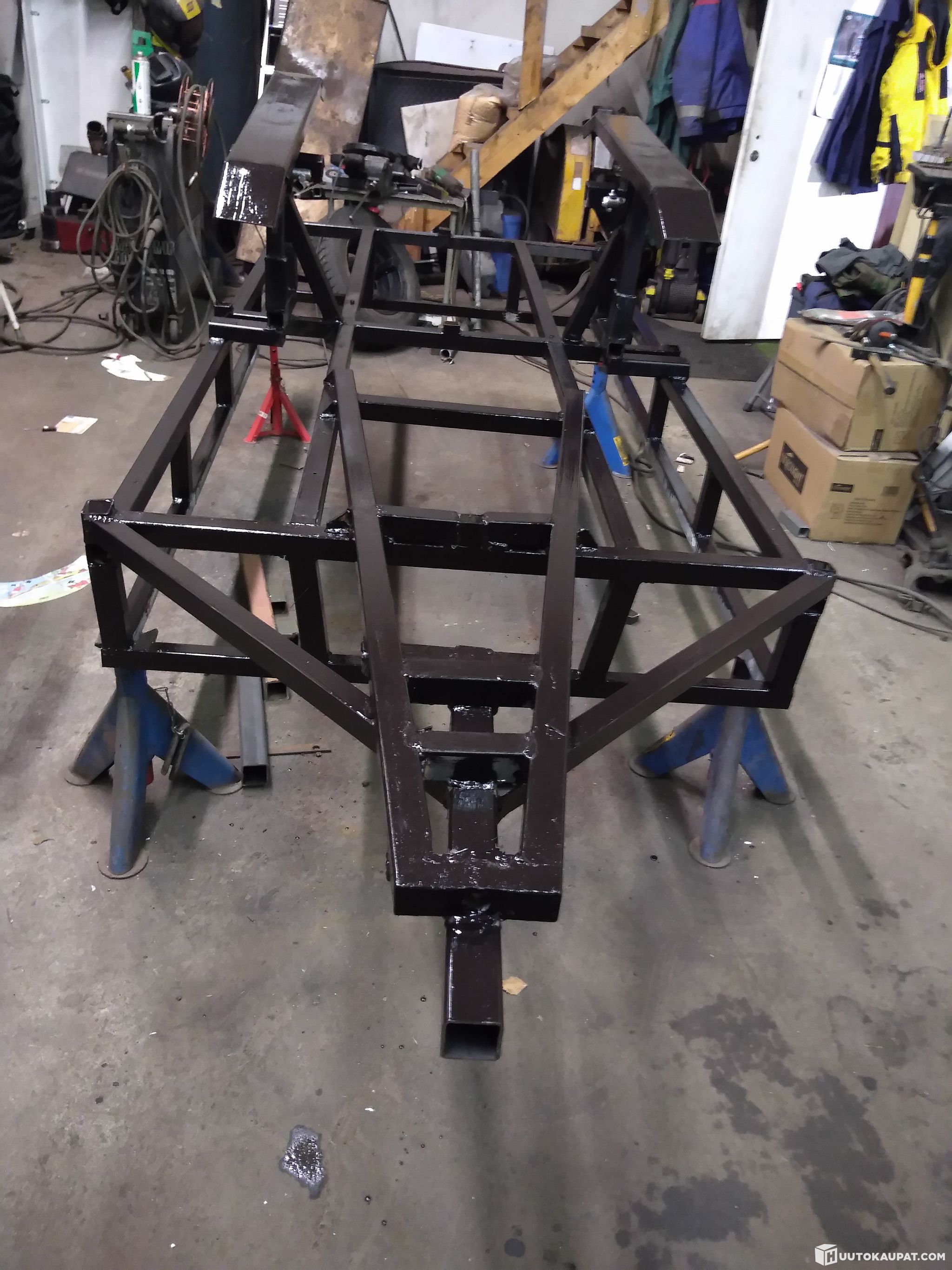 Custom-built. Sturdy construction with an RHS-tube frame. Can be towed behind an ATV, car or tractor. Replaceable drawbar for hook or tow ball. Easily removable base plate. Special features: quickly attachable wheels and removable skids.