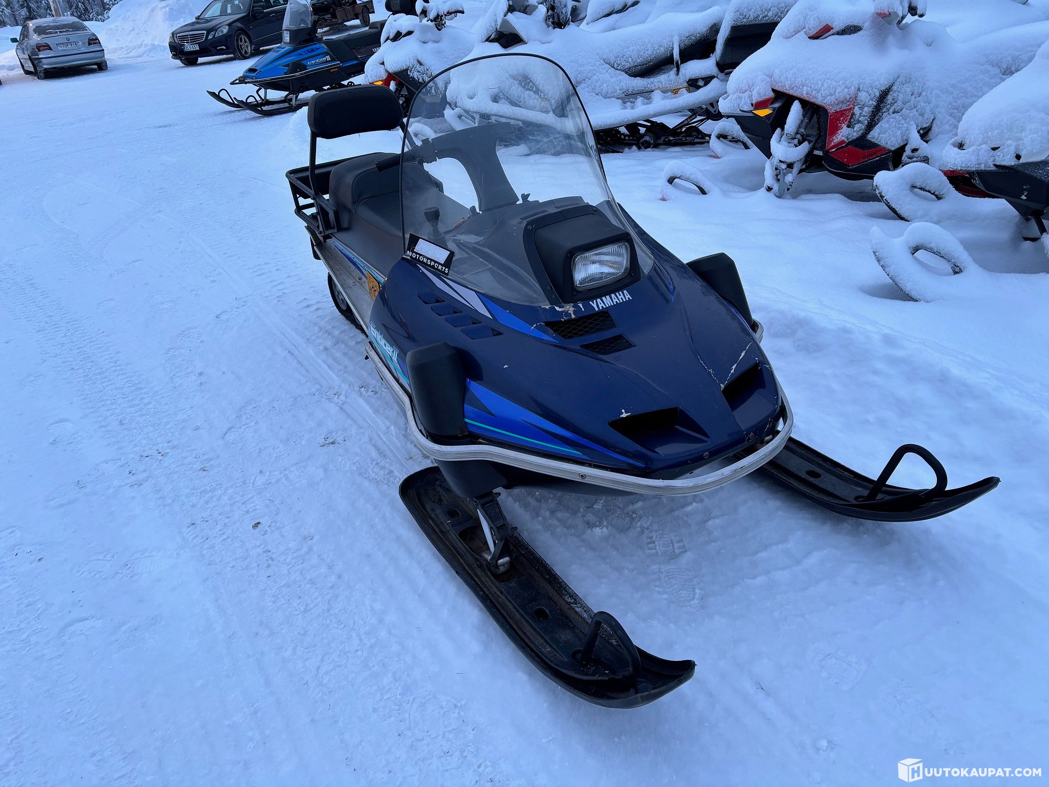 Working Yamaha Enticer II. 1999 and approx. 15,600 km. Reverse gear, tow hitch and two-person seat. Manual start. Snowmobile is operational, mat OK. Given its age and mileage, suitable as a cottage or ice-fishing sled.