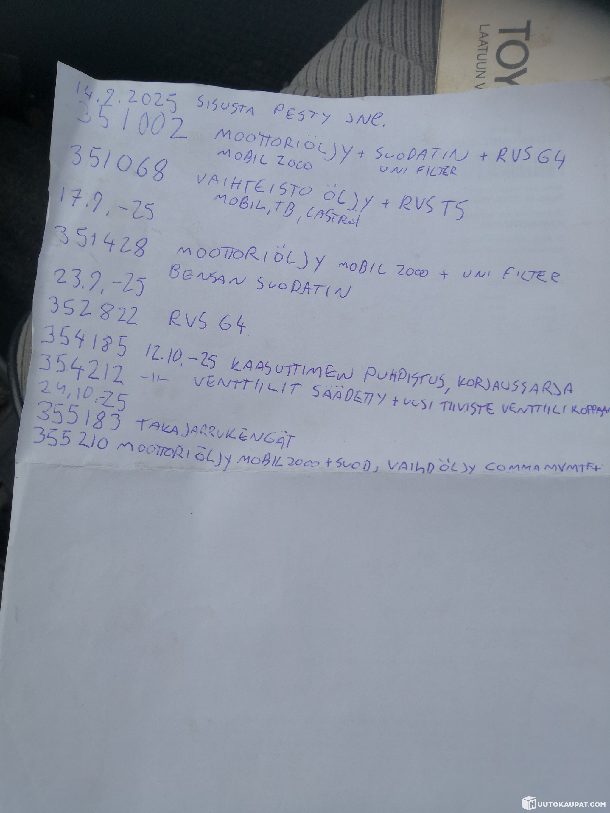 Good service book, pile of receipts, original purchase/warranty certificate, owner's manual and body & chassis repair manual in Finnish.
