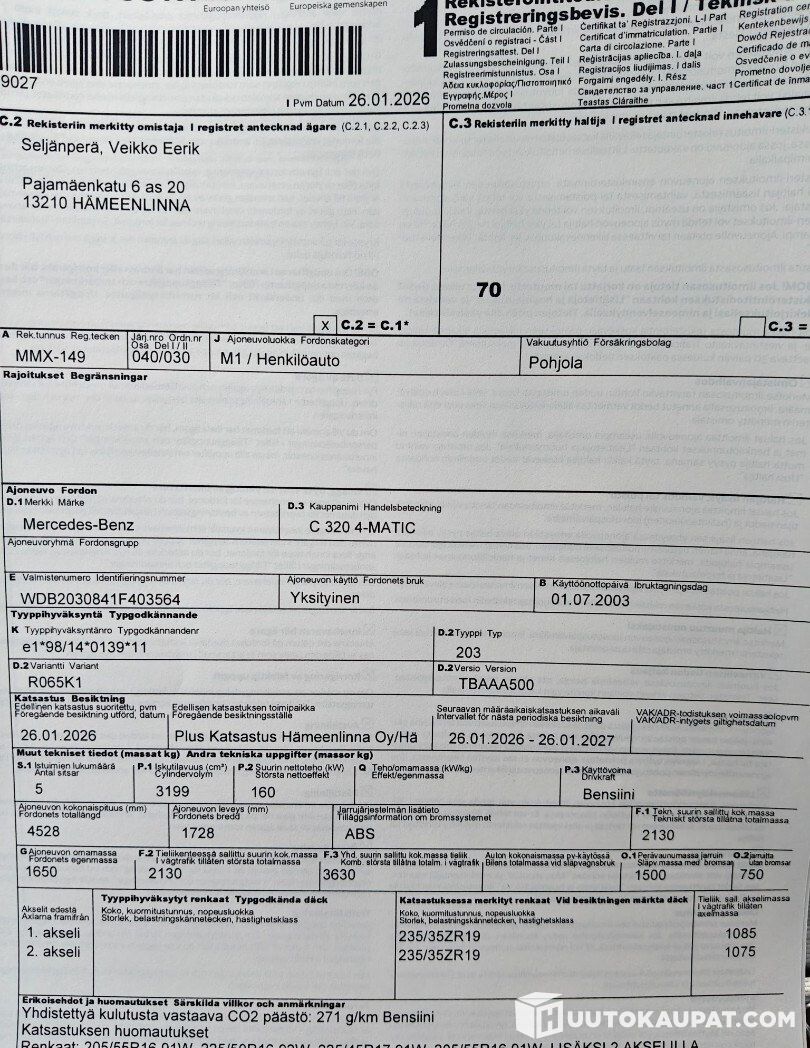 Avantgarde equipment incl. leather seats etc. Only minor surface rust on the body. Inspected today (26 January 2026). Home delivery possible. Summer tyres are without rims. 3.2 L, Petrol, 160 kW, Automatic, 363,000 km.
