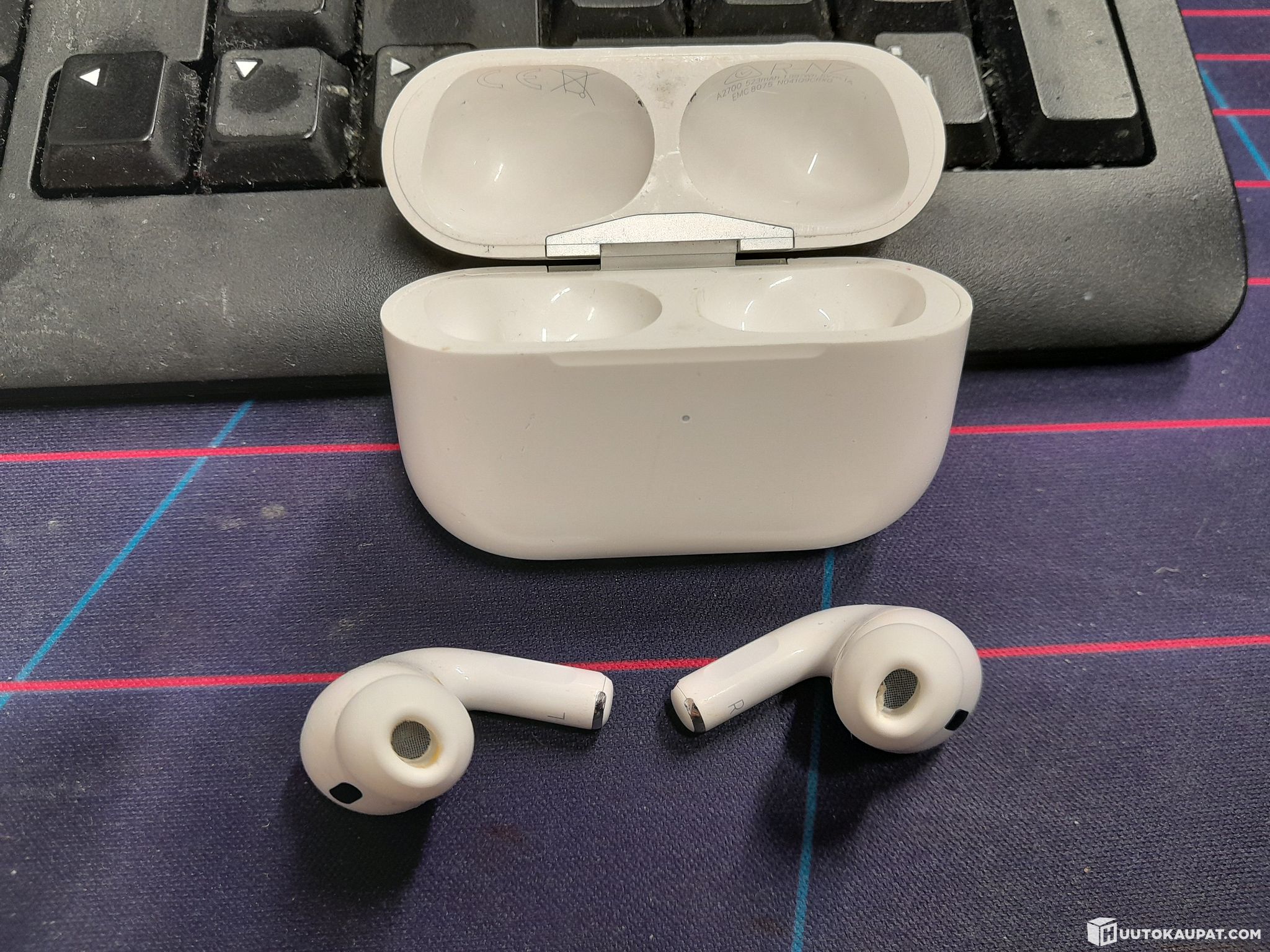 Used; includes earbuds, charging case and charger. Ear tips size M