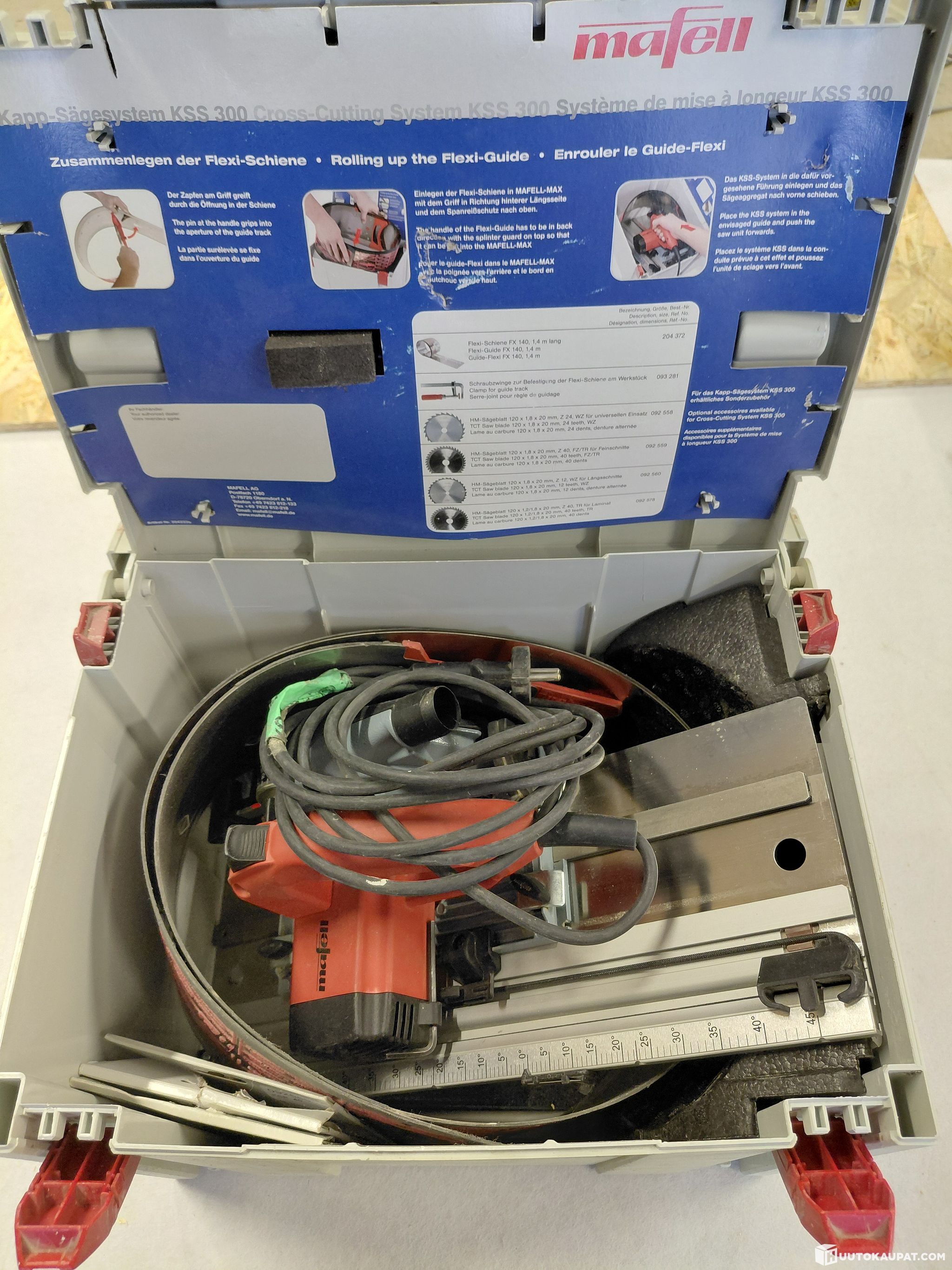 Handy Mafell plunge saw for installation work. Short rail for crosscuts and flexible rail for longer cuts — all stored in one case. Includes five spare blades. Used but fully functional.