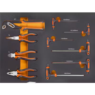 • 6 T-handle hex keys: H2×100 mm, H2.5×100 mm, H3×100 mm, H4×100 mm, H5×150 mm and H6×150 mm