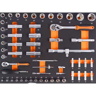 • 17 pcs 1/2" (12.7 mm) drive sockets: 9, 10, 11, 12, 13, 14, 15, 16, 17, 19, 20, 21, 22, 24, 27, 30 and 32 mm