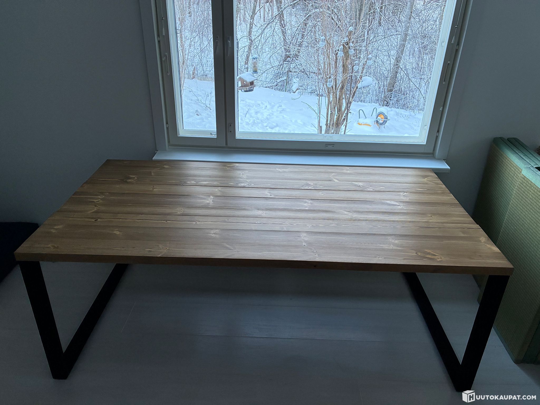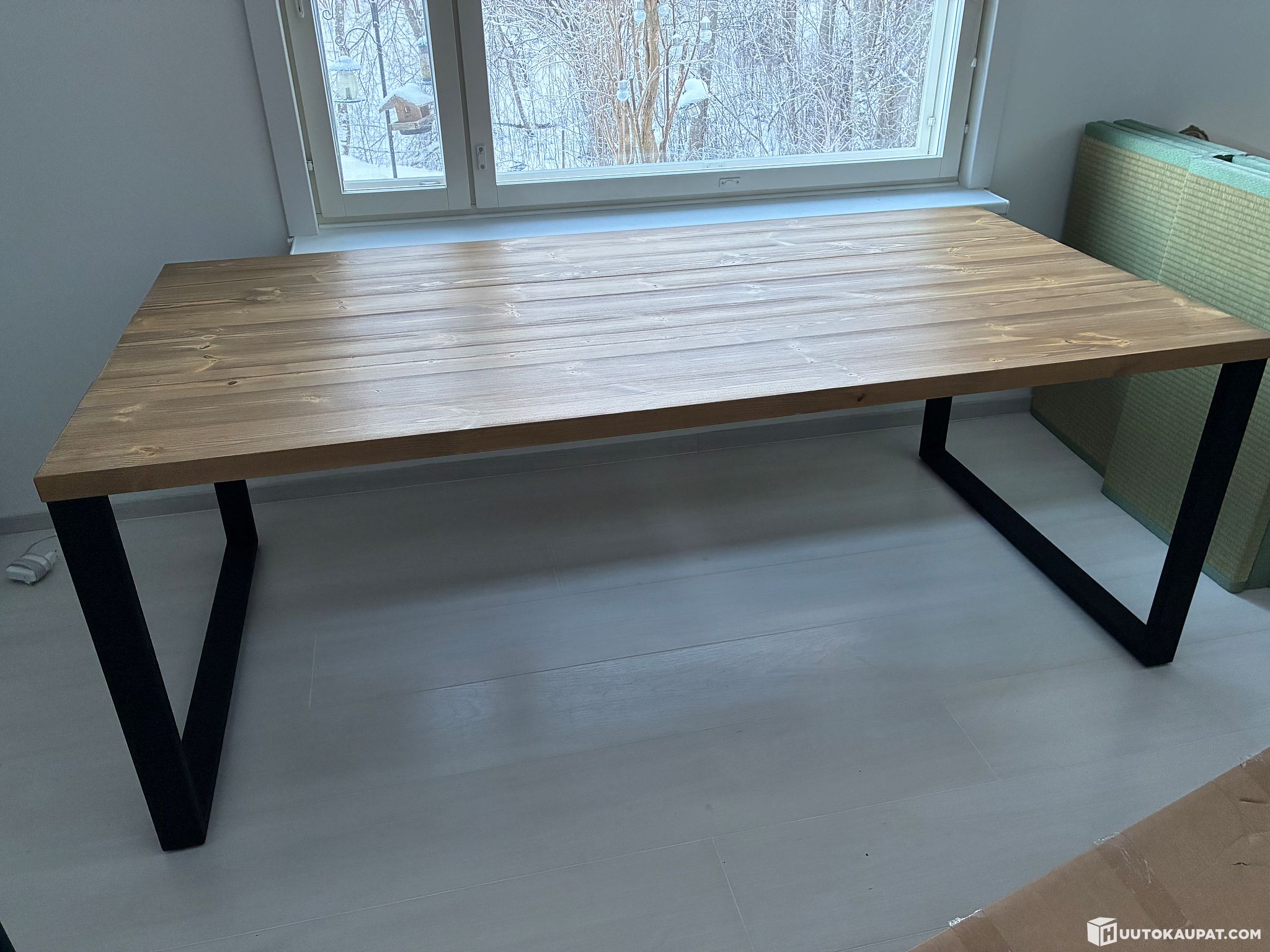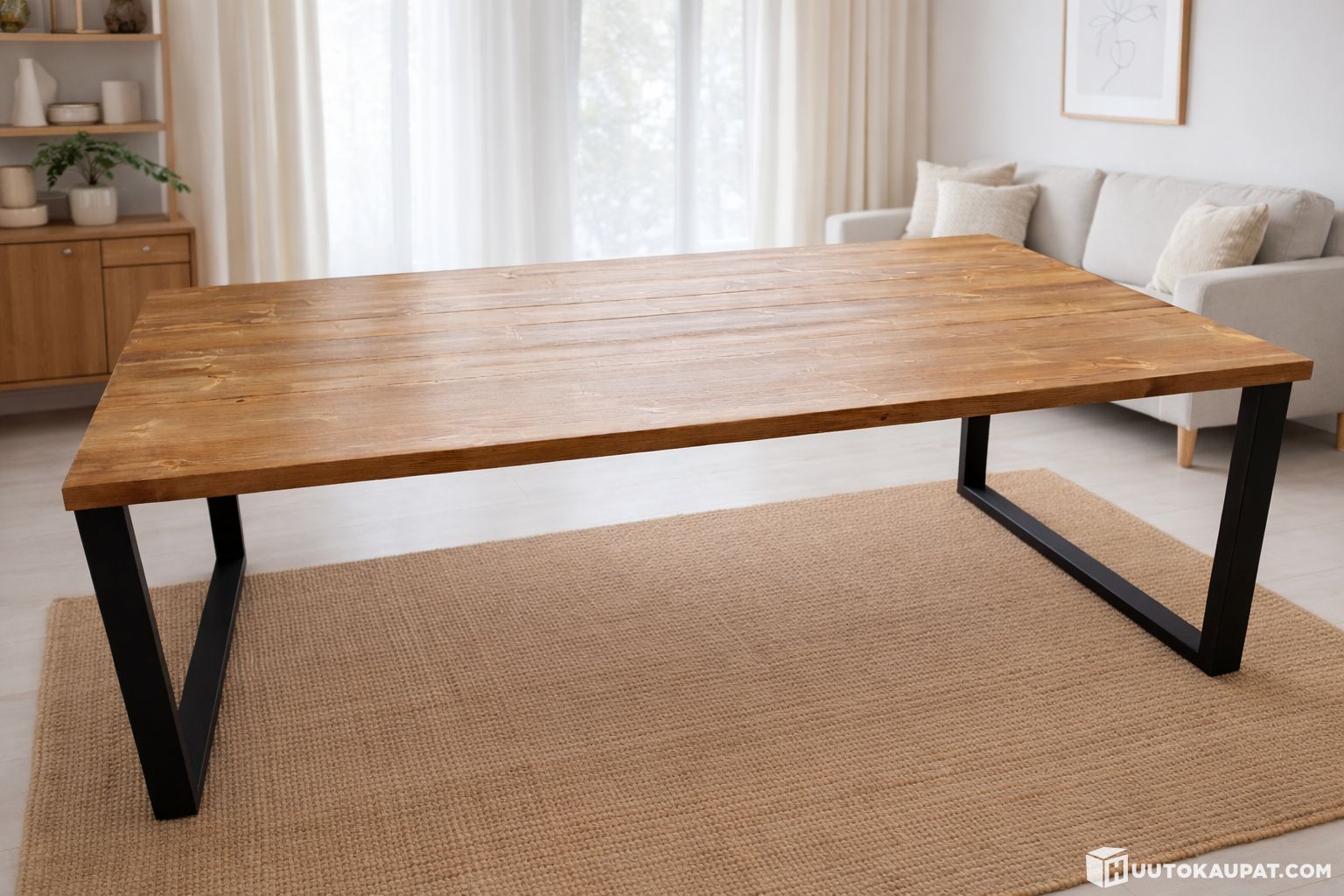 Note! In the photos the table is assembled only for the shoot — gaps between the planks and the leg spacing can be adjusted during final assembly to the buyer's preference.