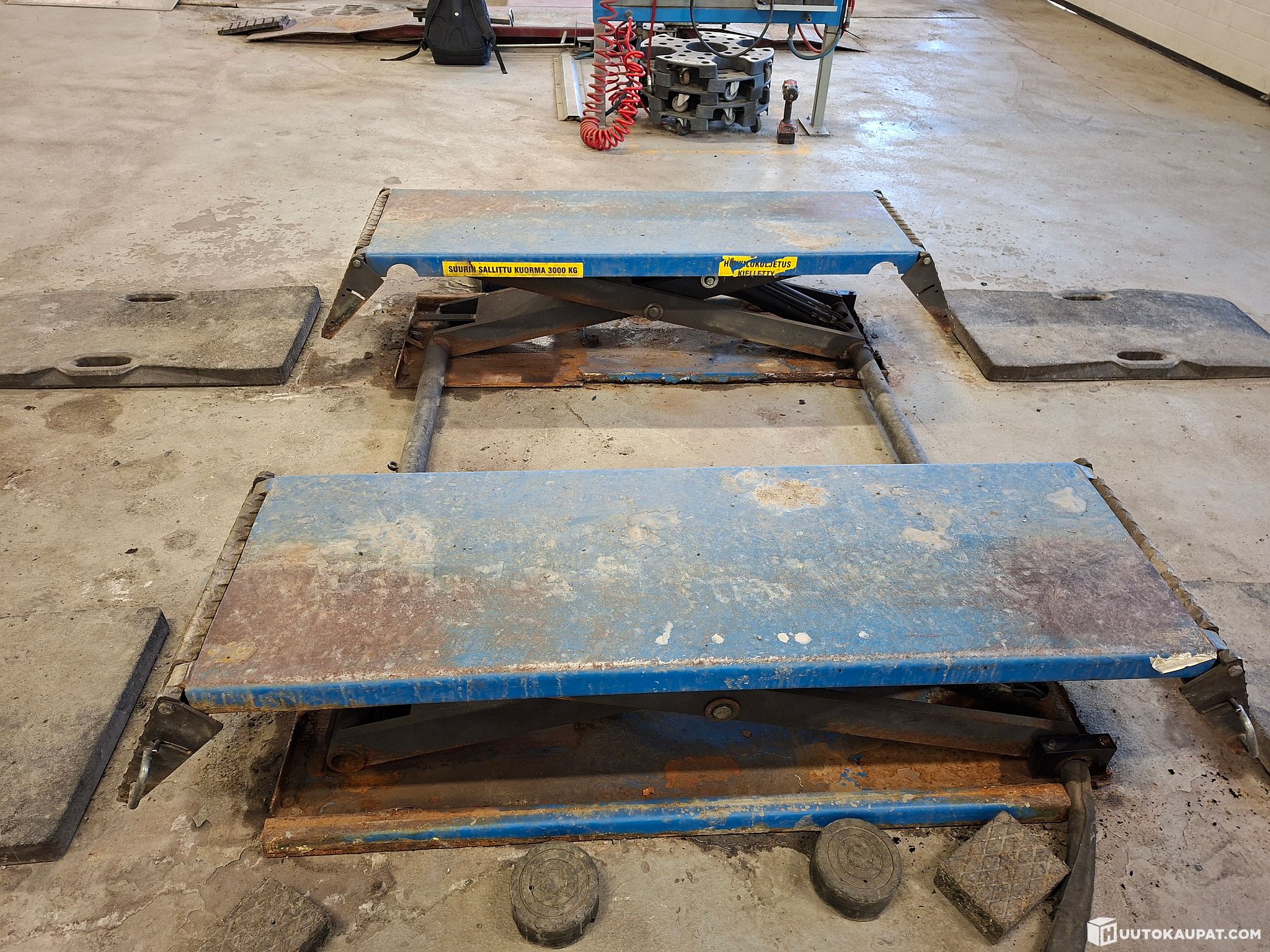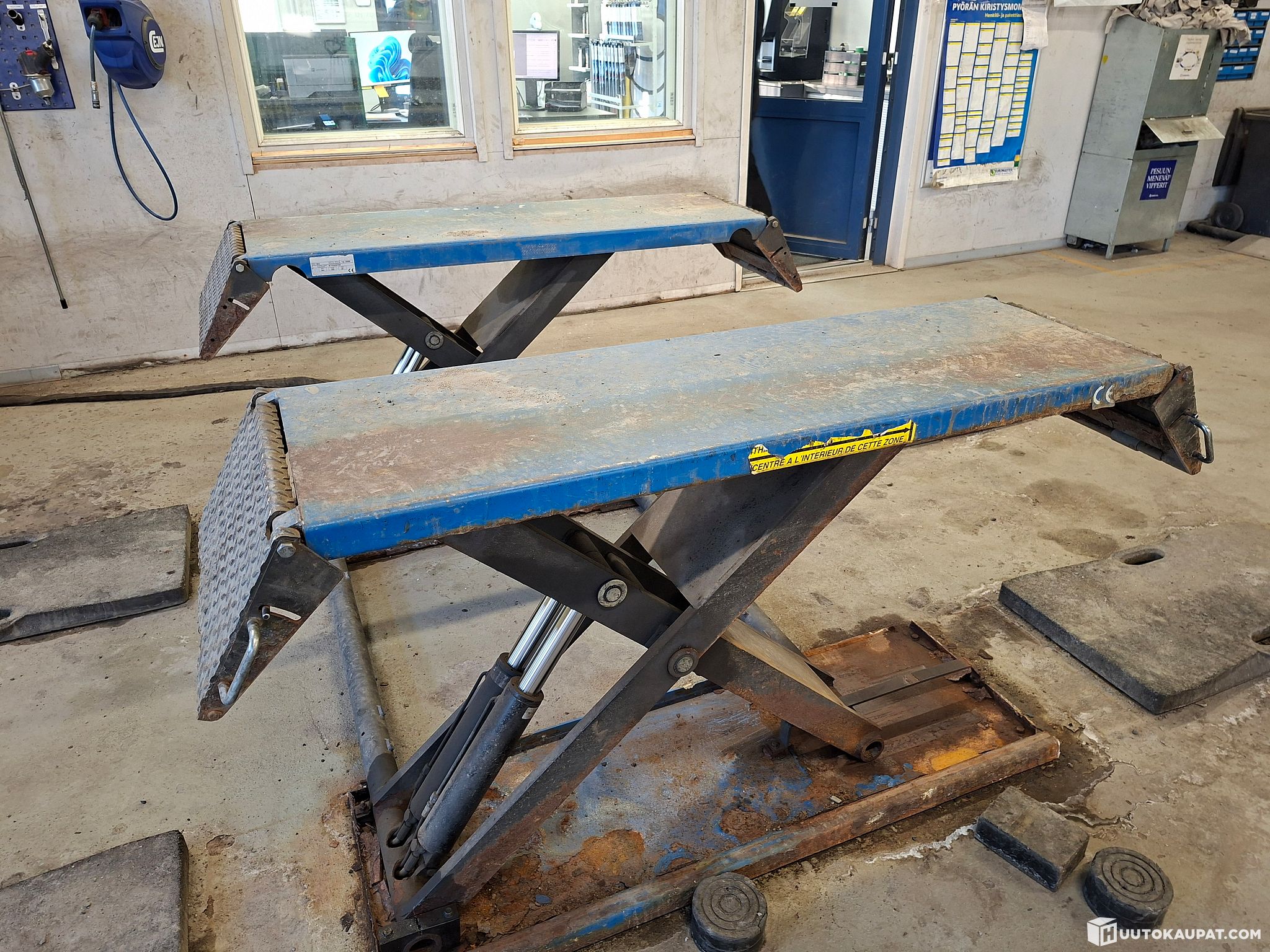 Please inspect and try the unit before bidding at the Euromaster Joensuu branch. The rubber ramps and chocks shown in the pictures are not included in the sale. The buyer agrees to dismantle the lift themselves before the 10th week of 2026; assistance with loading onto transport by forklift can be provided.