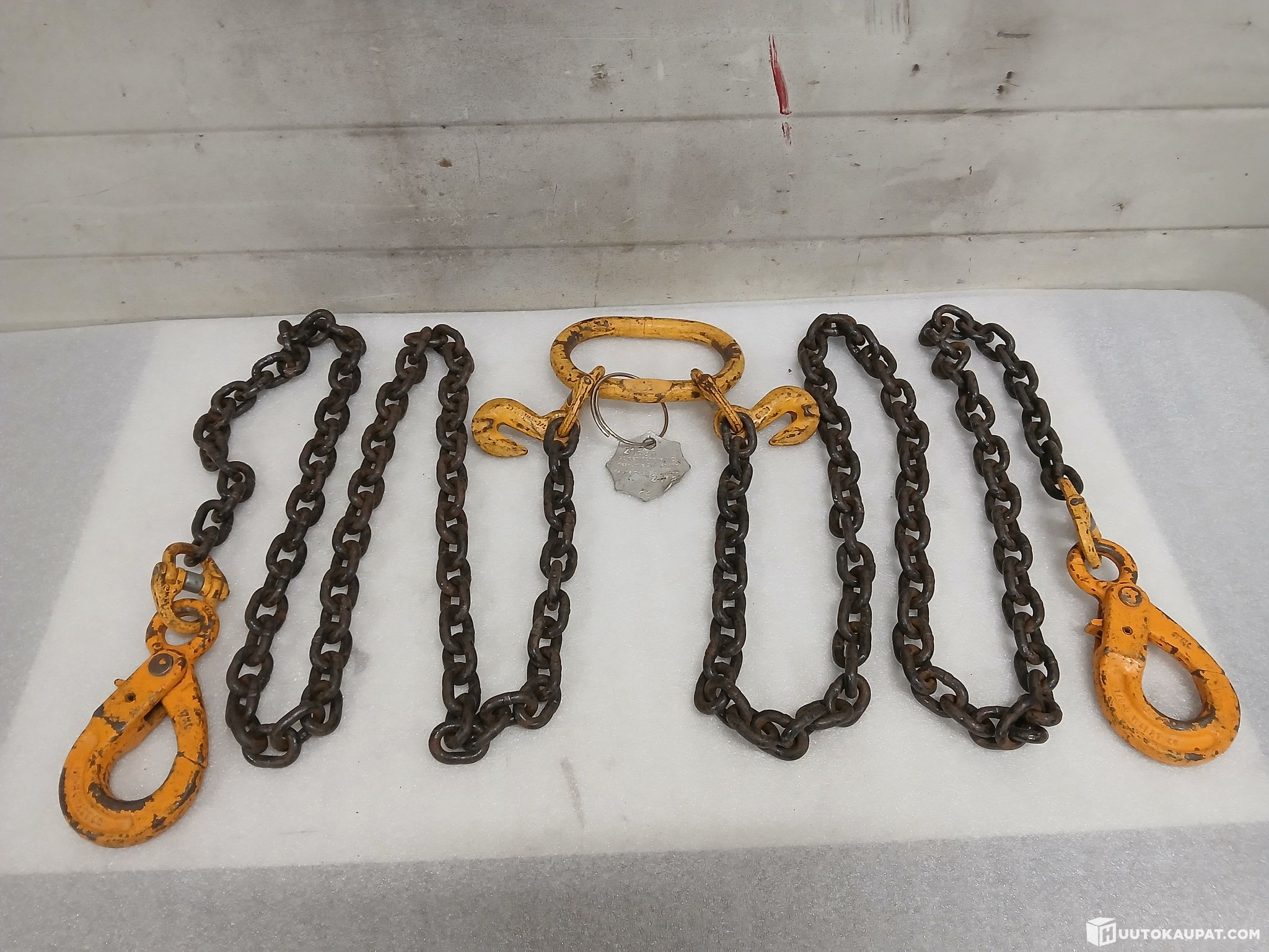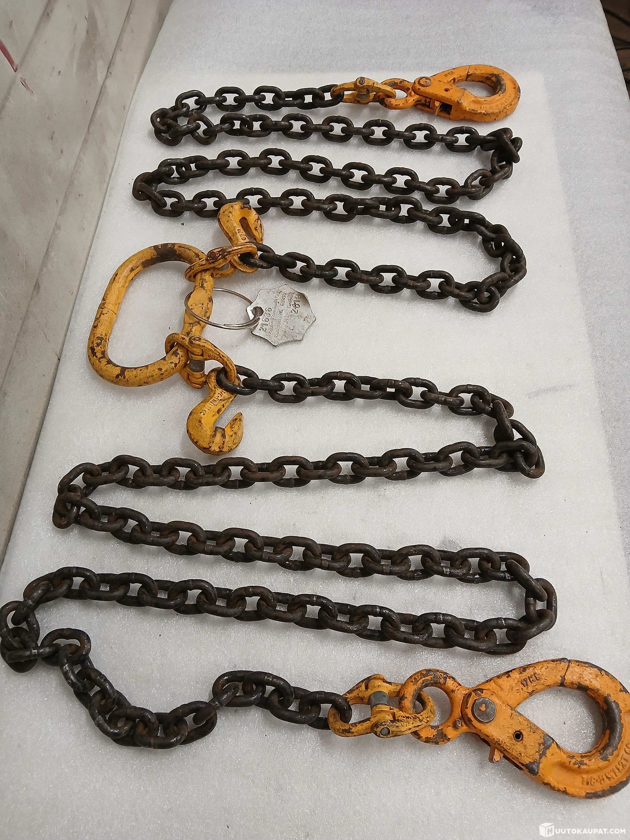 Two‑leg lifting chains with shortening links. The lifting hooks have quick‑release locks and are safe to use. The chain is nearly unused. Chain link thickness 8 mm. One leg length 2,000 mm. Rated 2,800 kg, but will almost certainly withstand more. Suitable for all kinds of lifting work. Delivery can be arranged anywhere in Finland to your doorstep if required. If collecting the item, collection times can be arranged flexibly in the evenings and at weekends. No collection fees apply. Collection can be arranged very flexibly if needed.