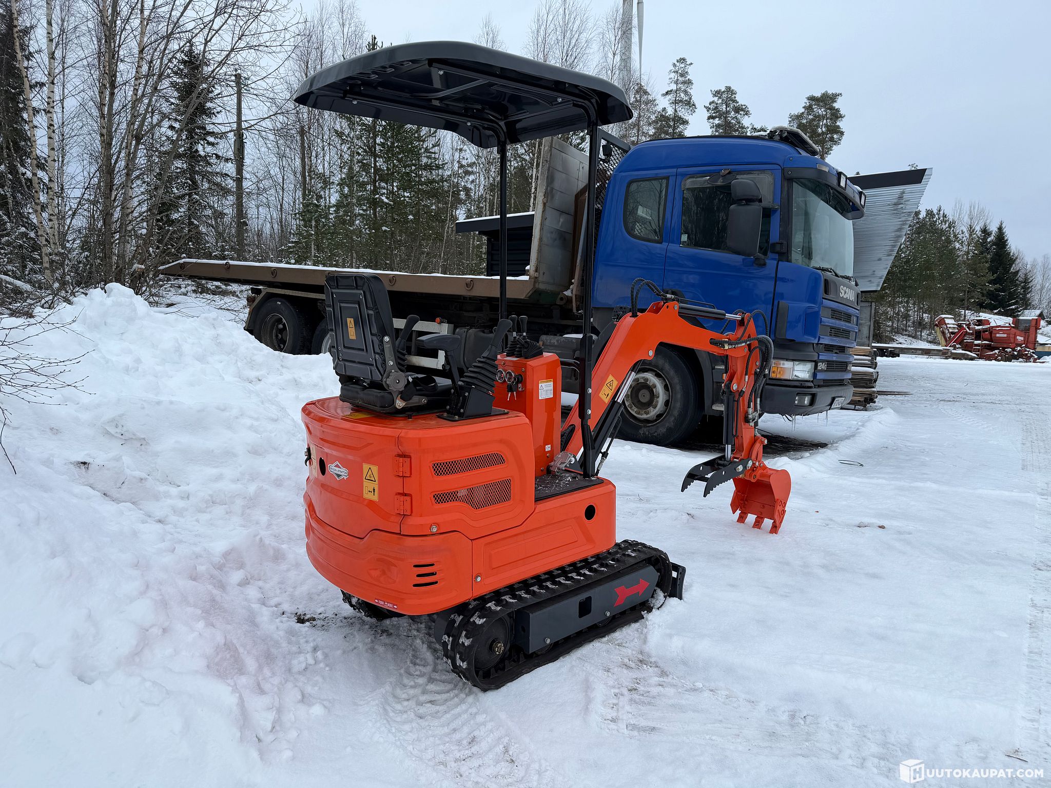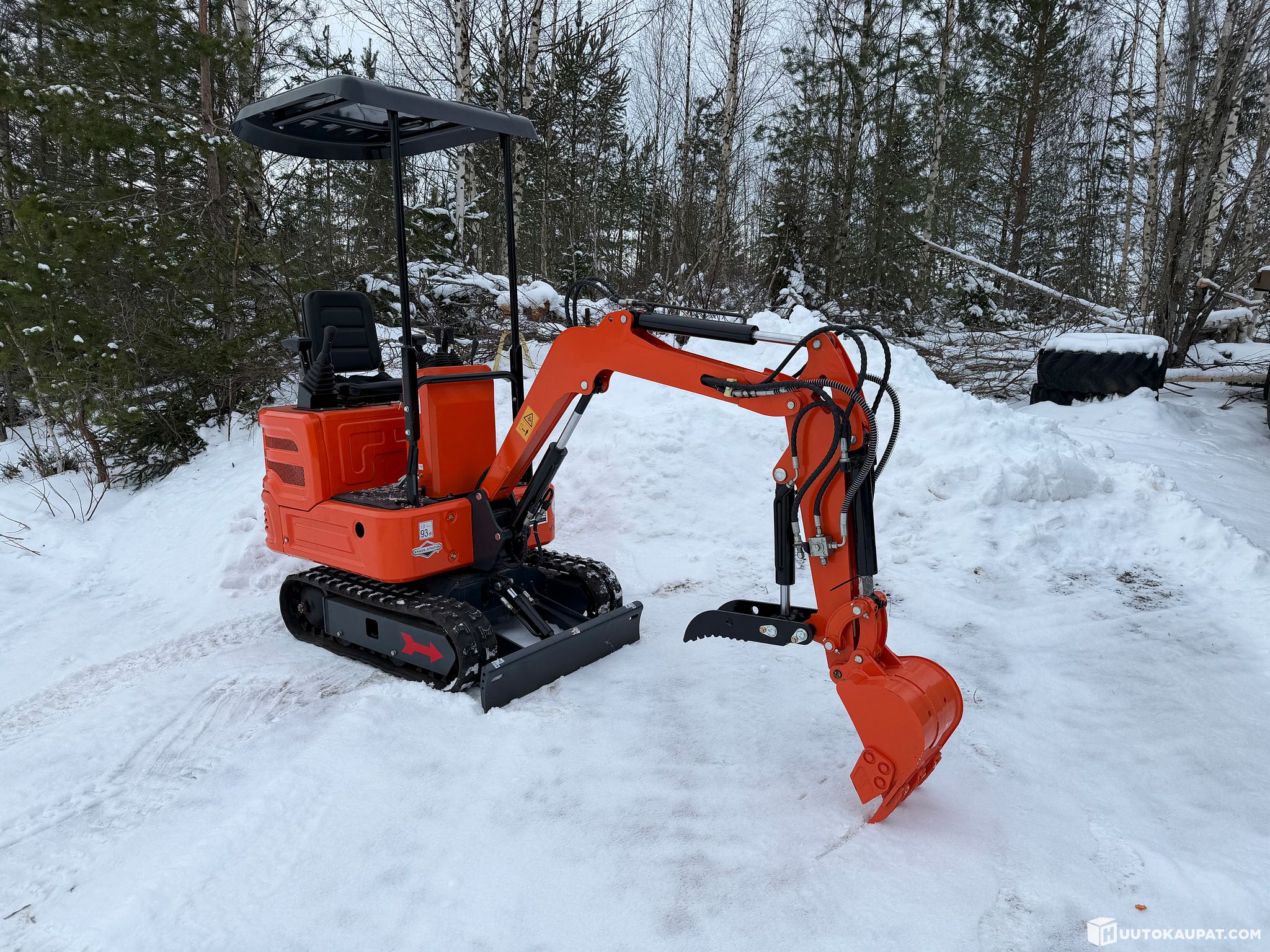 Equipment: rubber tracks, pilot-operated hydraulics, auxiliary hydraulics x2, hydraulic grapple on the boom (good e.g. for lifting trees), dozer blade, bucket. Removable canopy
