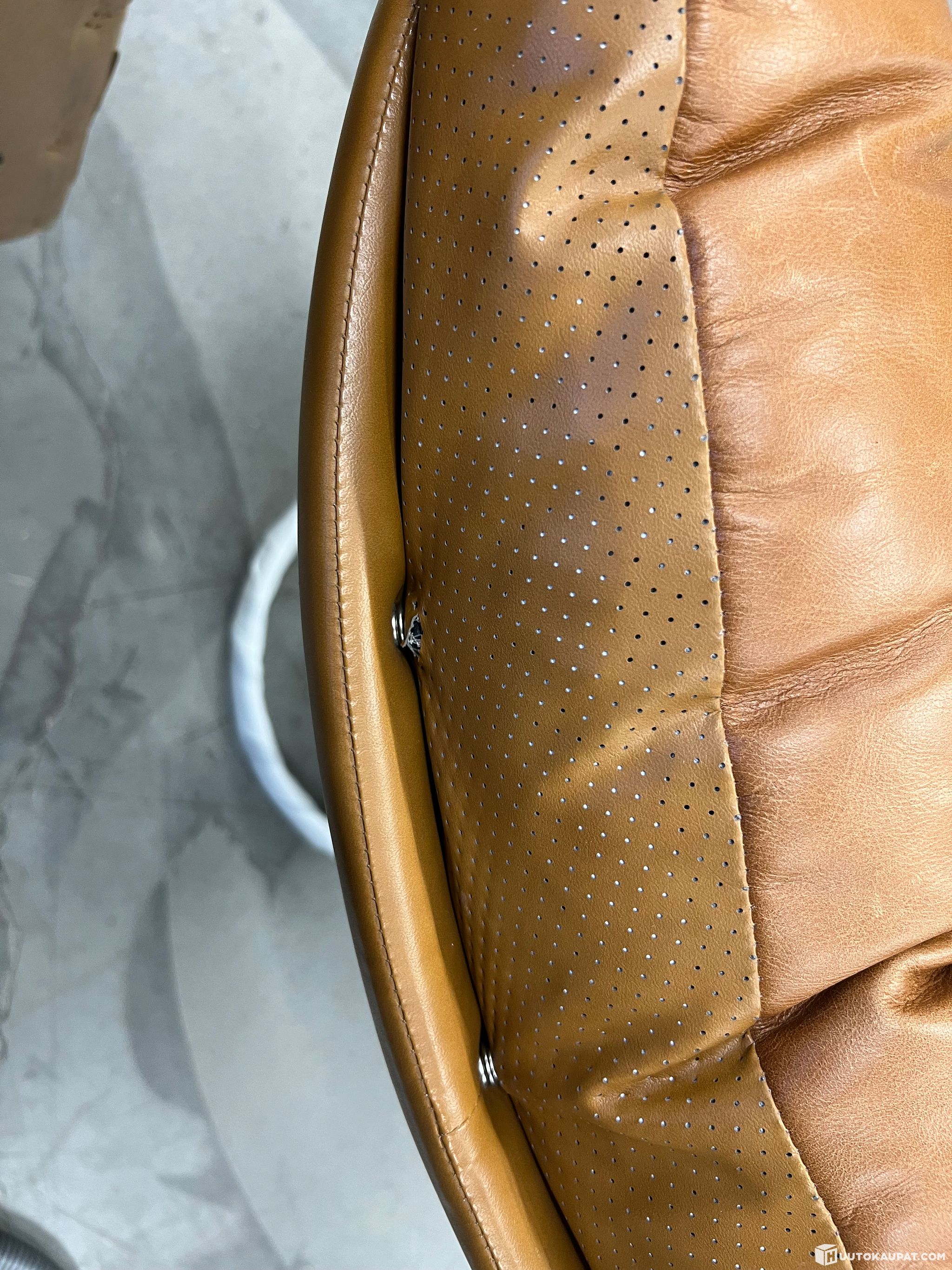 The armchair has been used for almost a year. The leather has split around one seat fastening. There is fraying at the armrest seams. The armchair shows wear consistent with the photos.