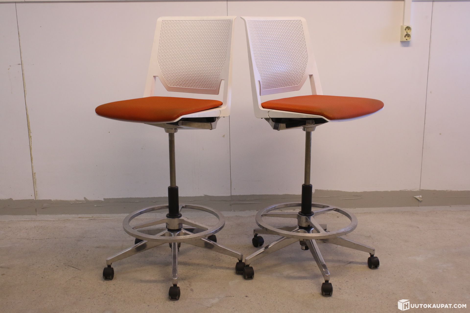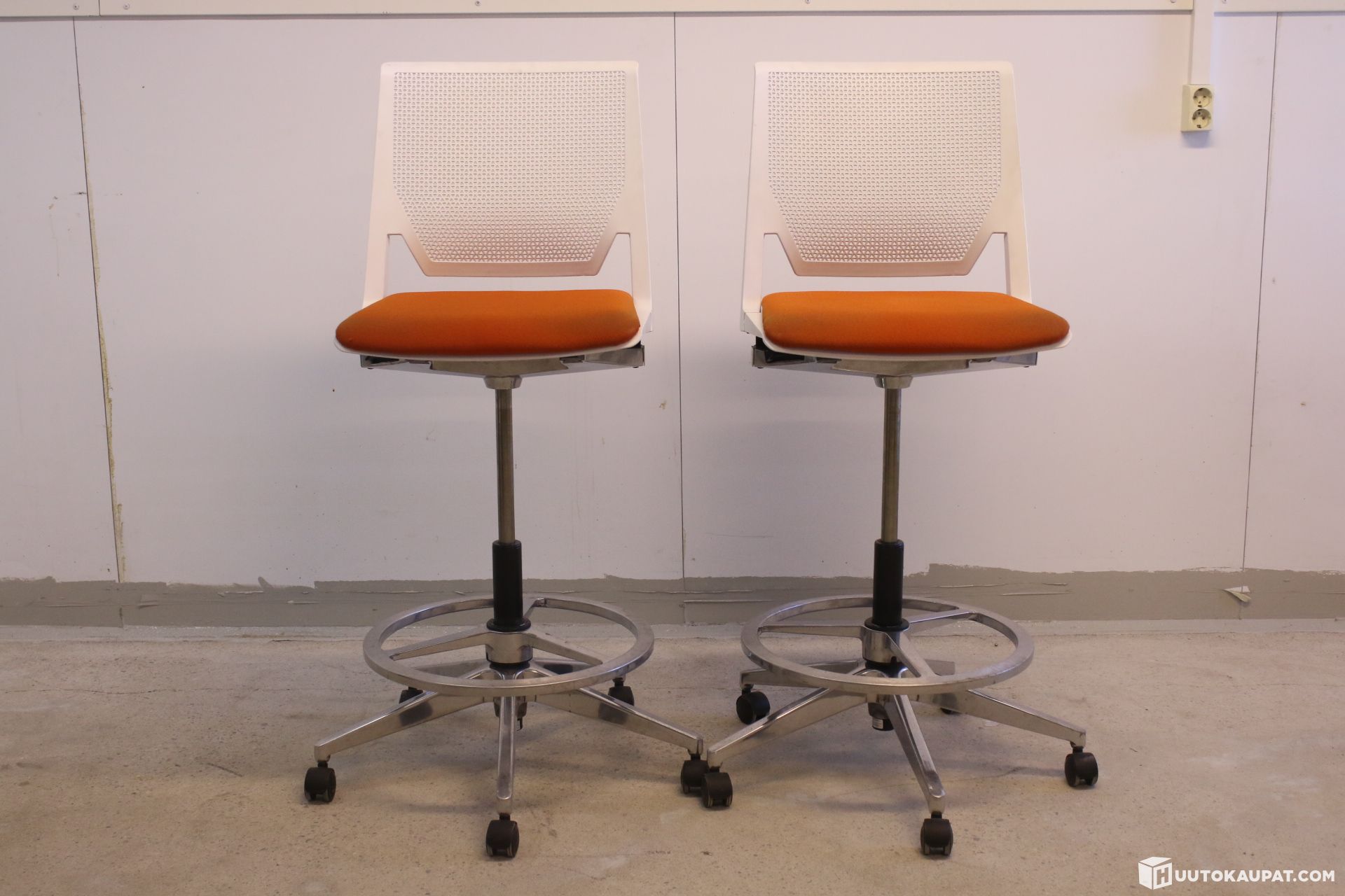 High-quality, modern Haworth Very task chairs. White mesh back and orange seat. Tall gas column, foot ring and aluminium spider base with castors. Ideal for service points or next to desks and worktops of different heights.