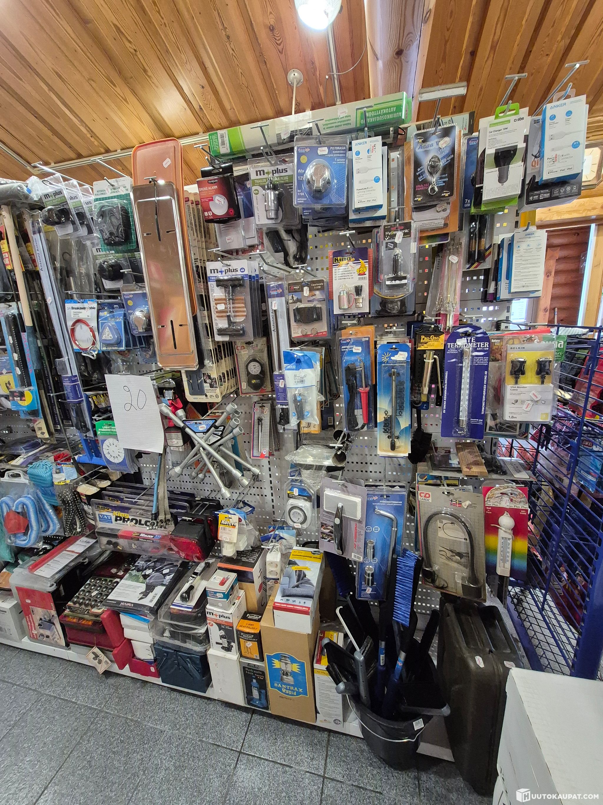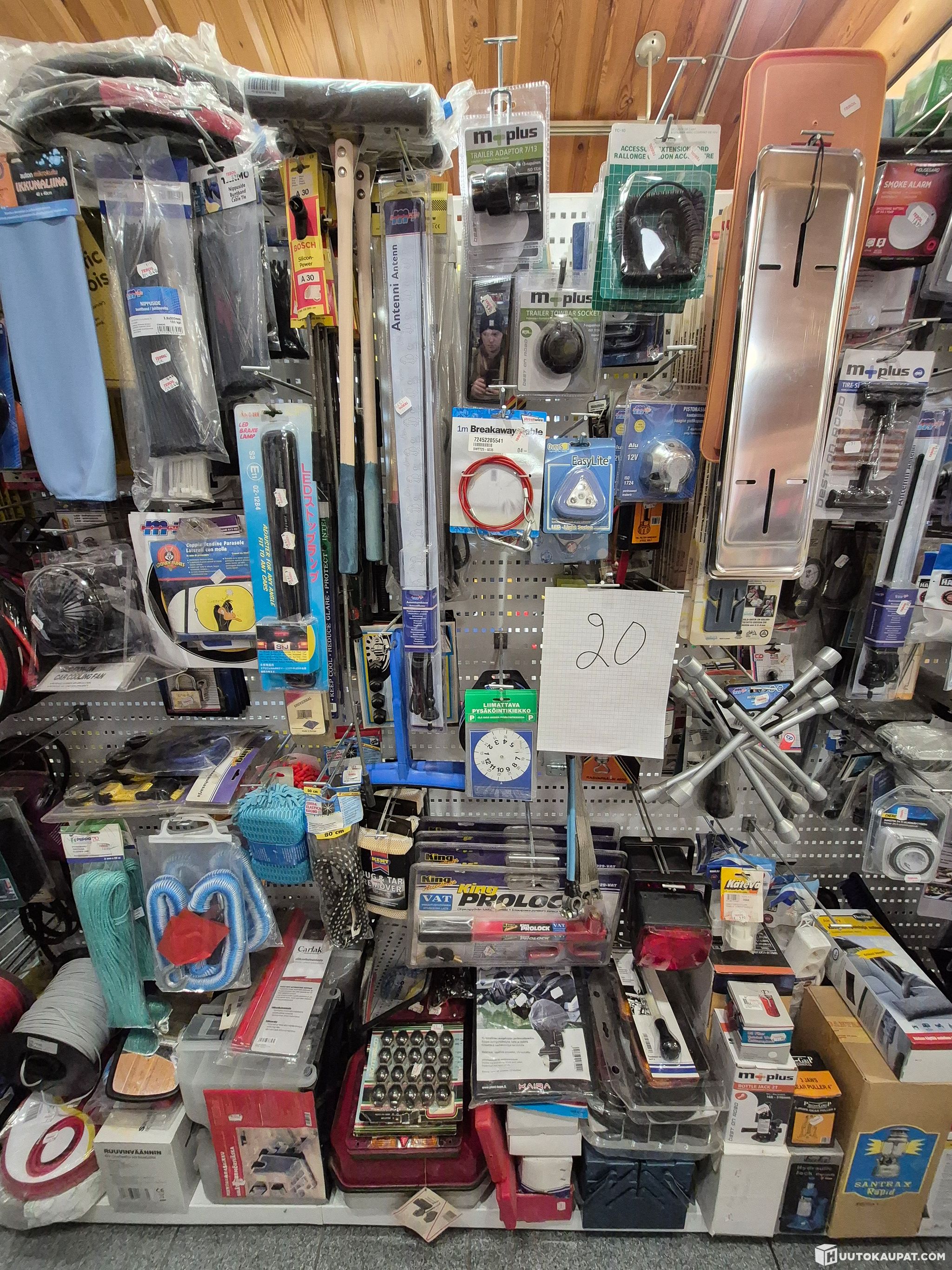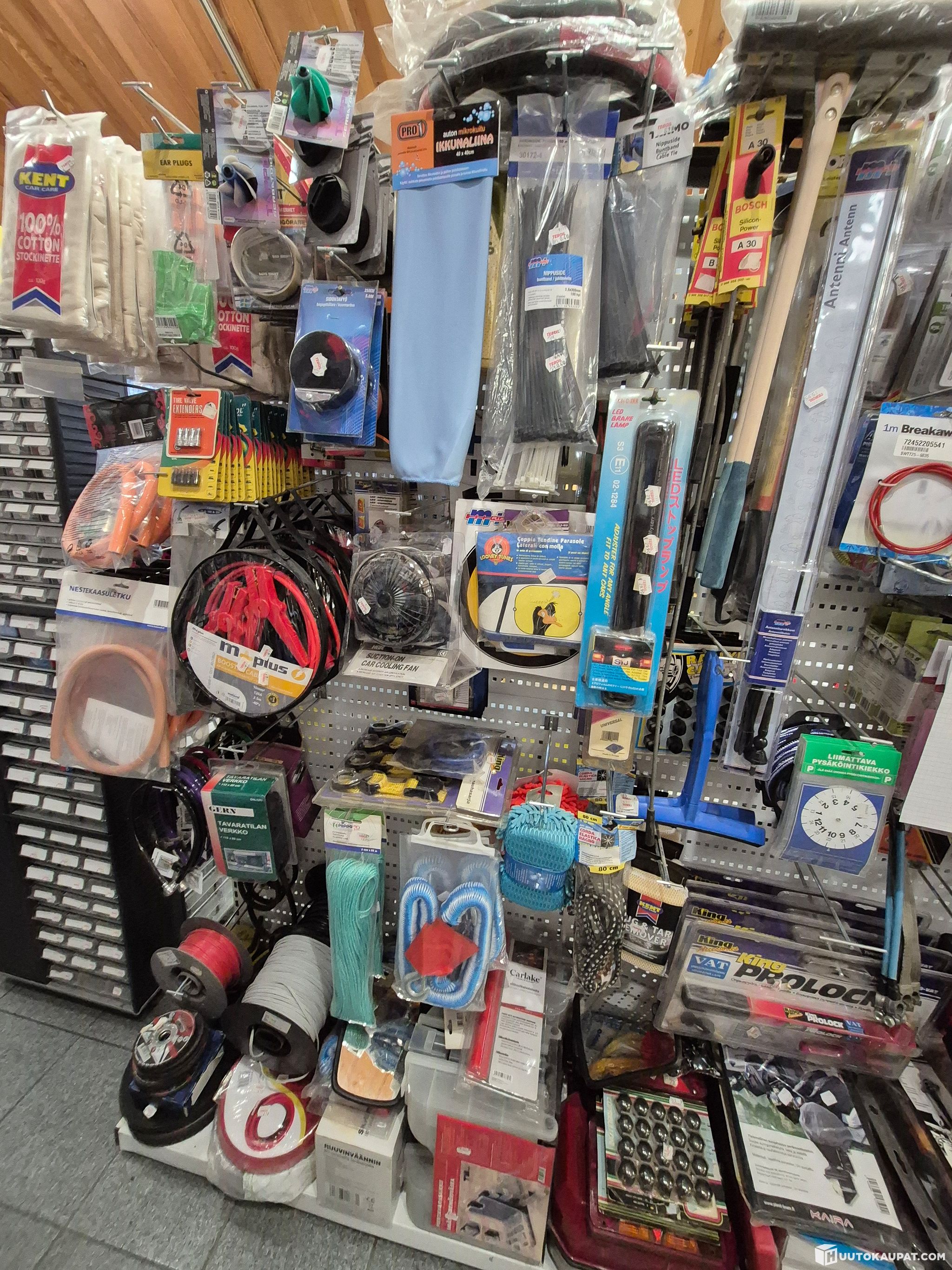 Mobile phone chargers, car power sockets, tyre repair kits, radio aerials, gauges, spark plug sockets, soldering irons, timer switches, nut wrenches, snow brushes, jerrycans, hacksaws, extension leads, cross wrenches, seat belt holders, number plate backing plates, steering wheel locks, toolboxes, hydraulic jacks, car dehumidifiers, windscreen washers, spark plug leads, steering wheel covers, cable ties, sponges, drying chamois leathers, warning triangles, small carry cases, screwdrivers, tow ropes, tie‑down straps, fans, locks, jumper cables, cleaning sponges, jerrycan spouts, gas hoses/regulators, bicycle cable locks, fan belts, electrical cables, air hoses, cutting and grinding discs and clothesline.