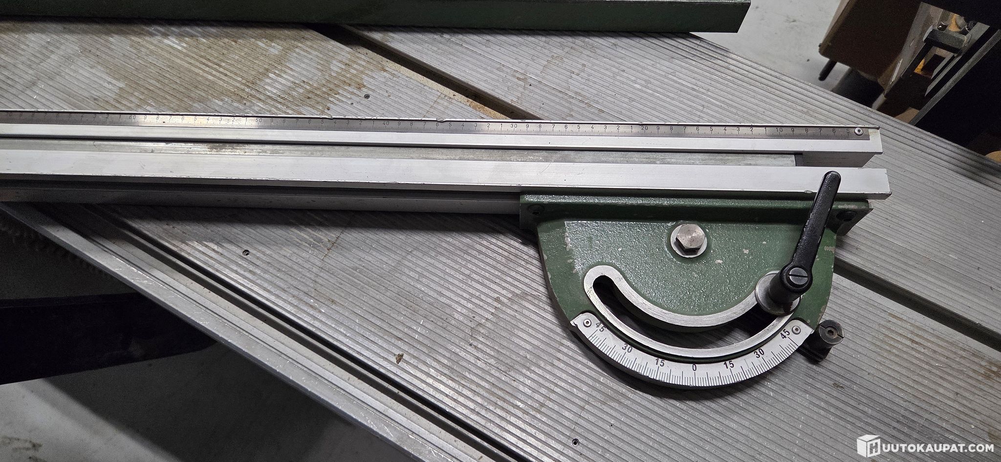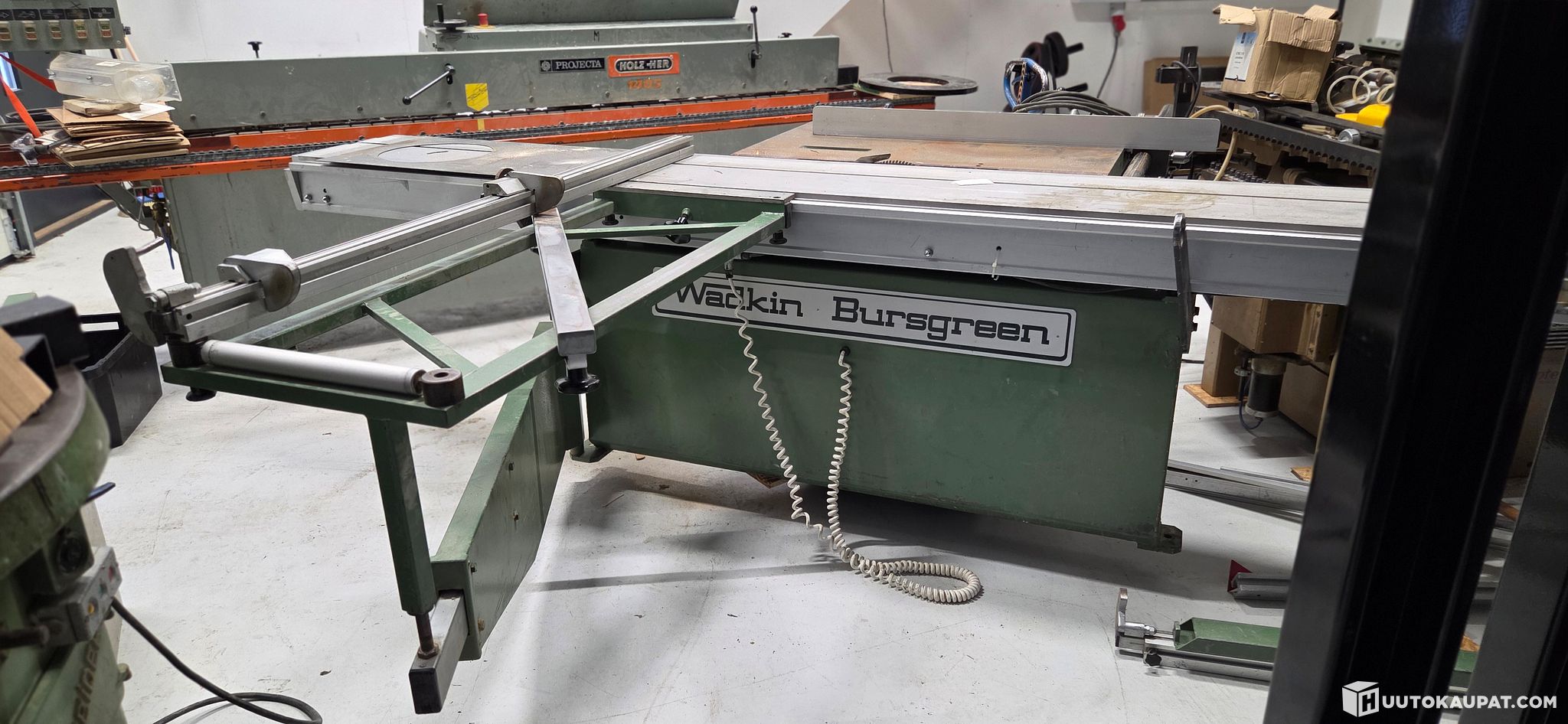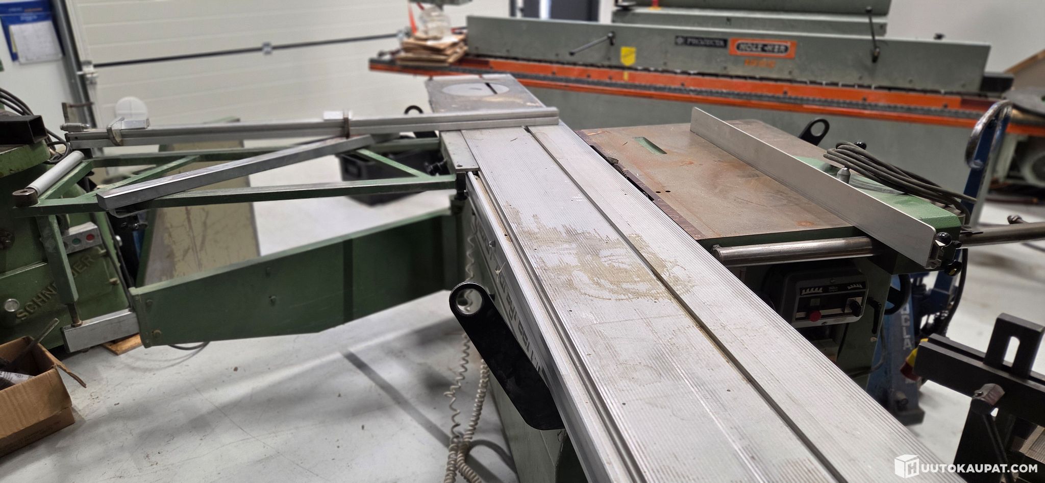 For sale: circular saw from an estate. The saw has a 3500 mm feed table. The blades shown in the pictures are included. The machine has been tested to power on; otherwise there is no information about its usage history or condition. The machine has been used commercially.