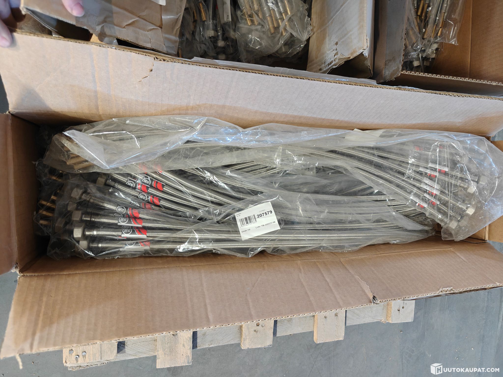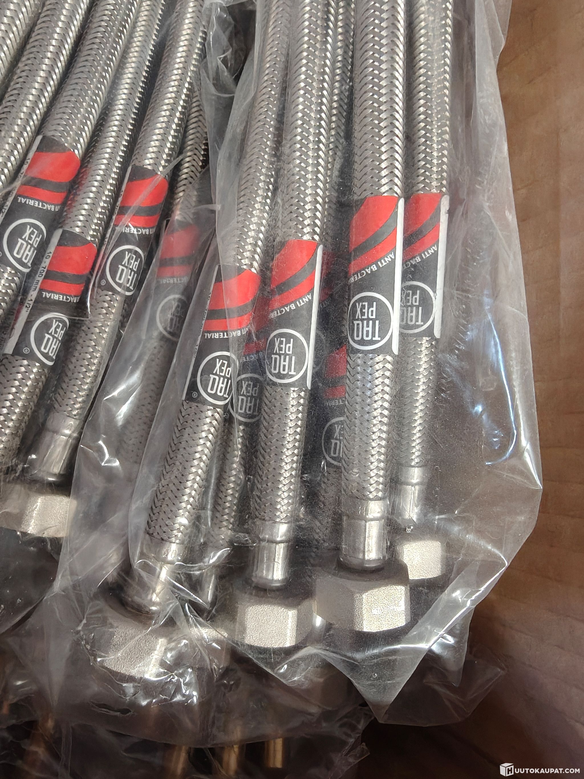 Large lot of stainless steel braided hoses (connection hoses) imported by LVI Pörssi for sale.