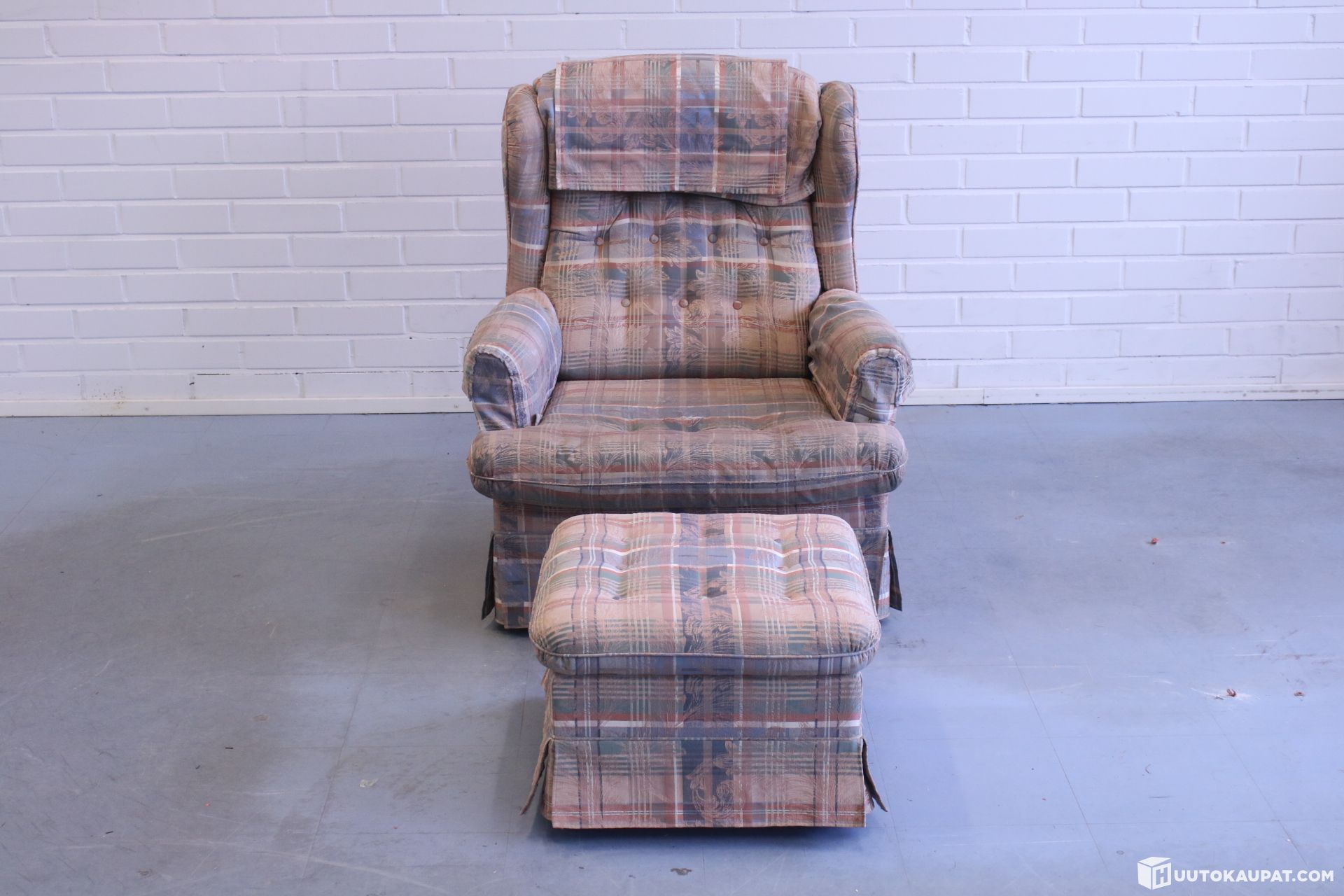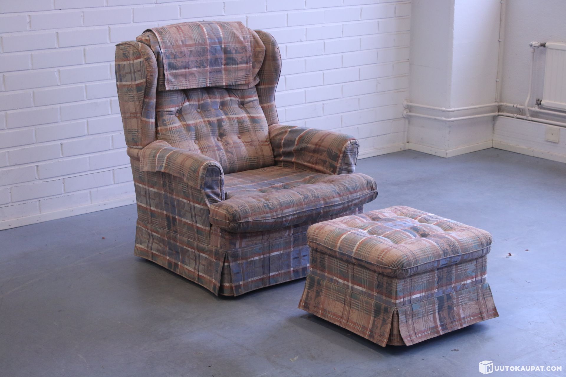 Comfortable armchair and footstool. Removable, washable covers on the armrests and headrest.
