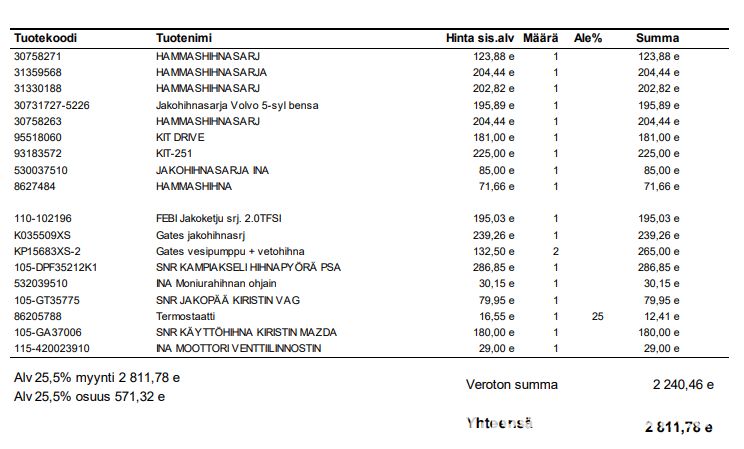 Timing belt kits and engine parts. Kiviniitty, Huittinen