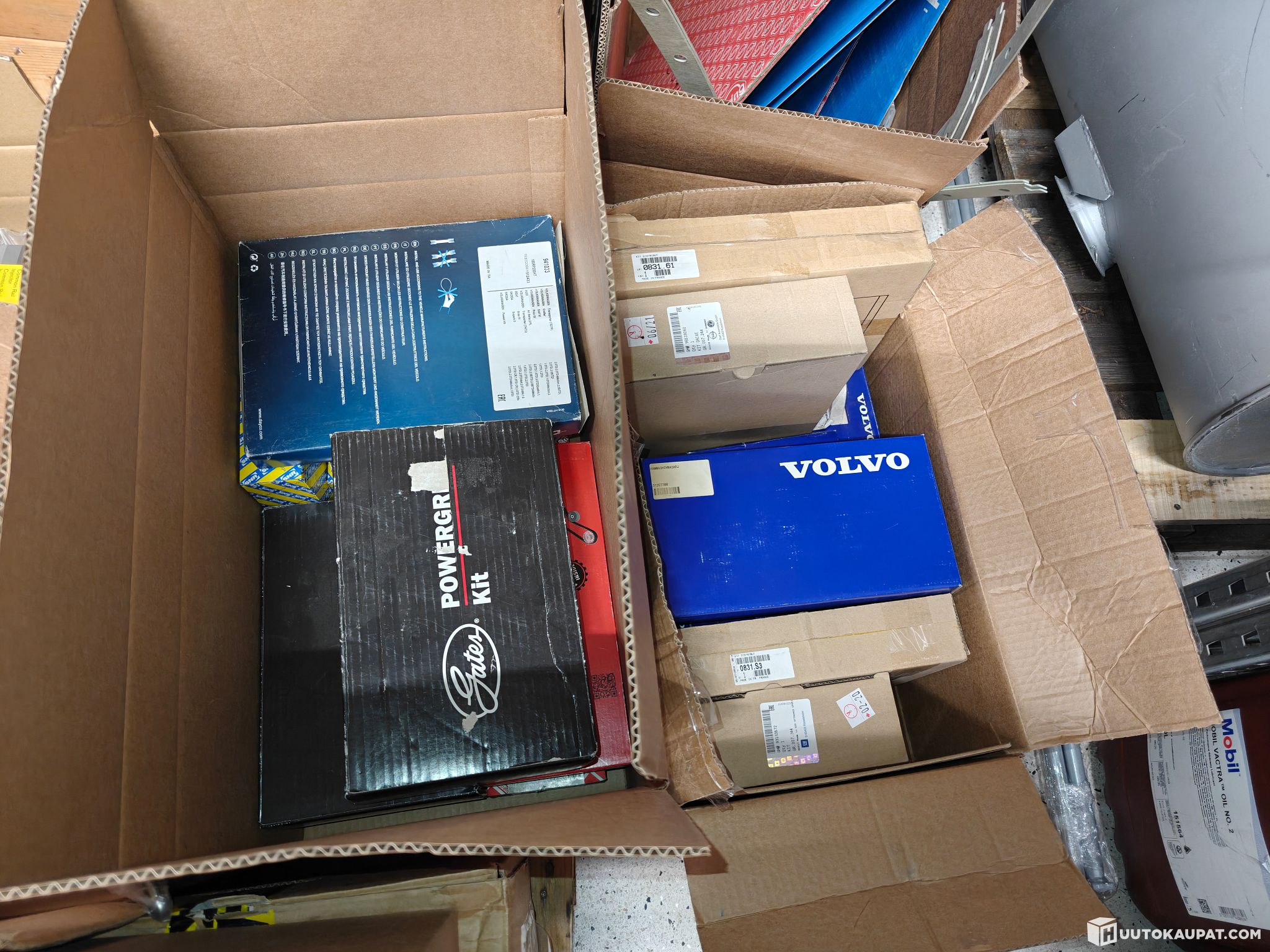 Package of Volvo and Opel timing belts, individual timing components and other engine parts.