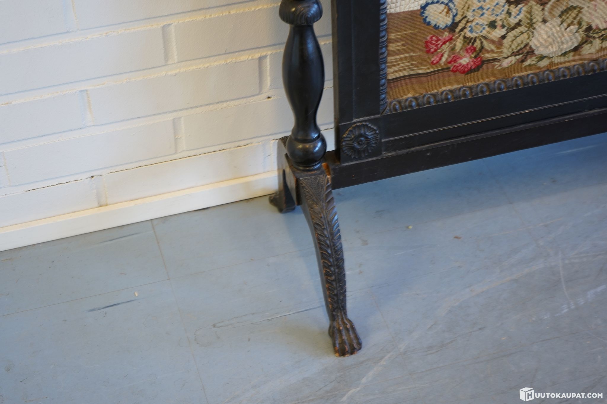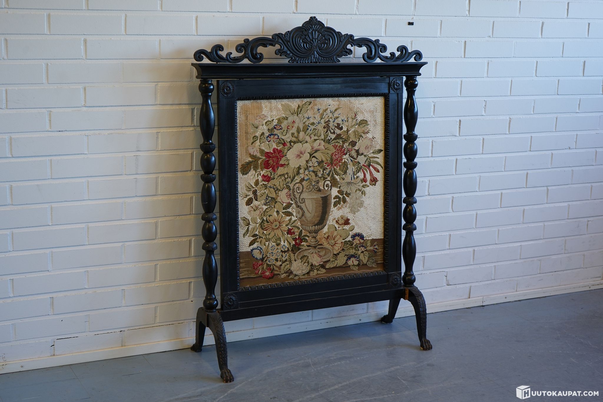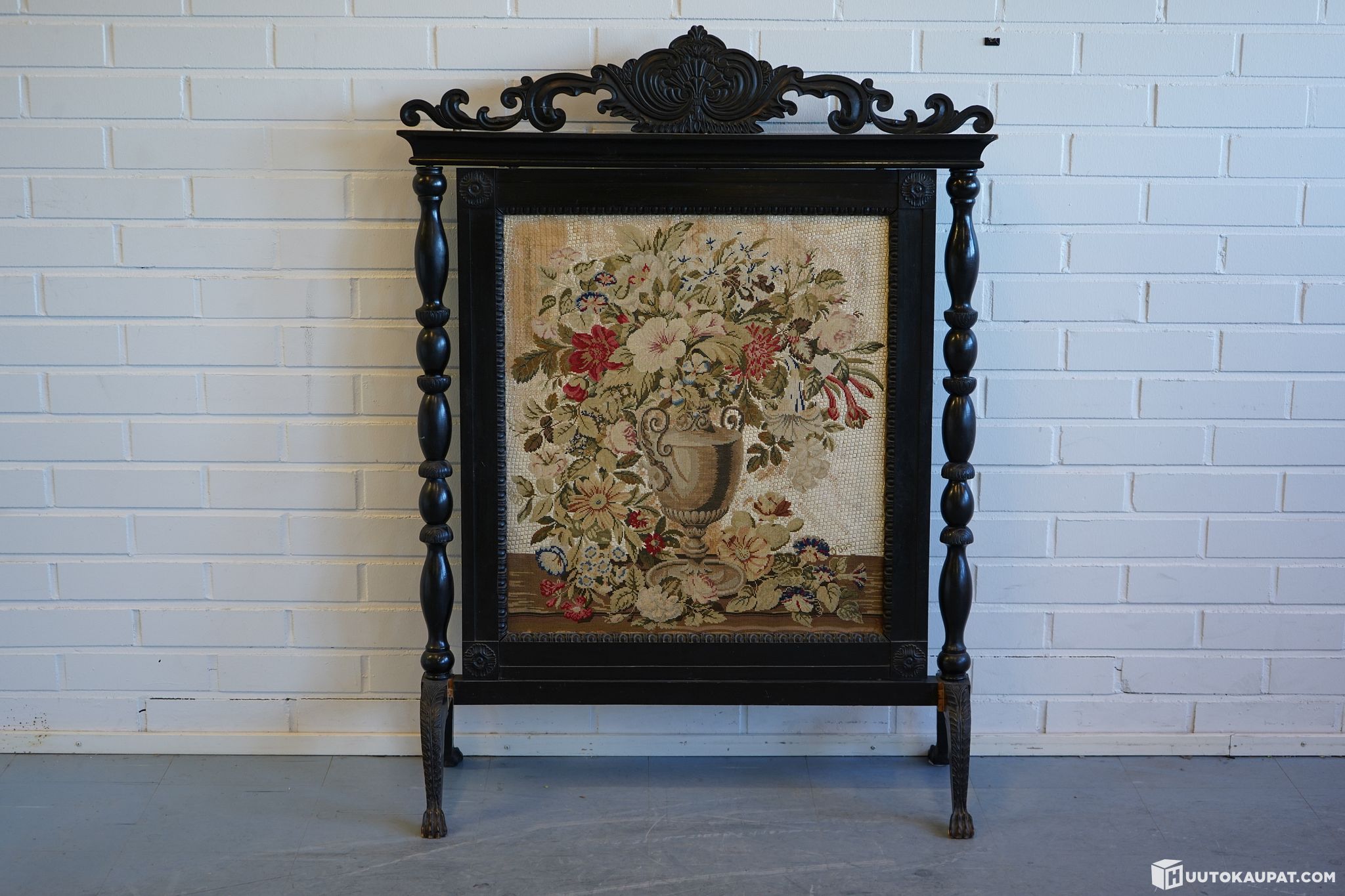 Striking antique‑style firescreen. Nicely decorated black‑stained wooden frame with a floral gobelin panel in the centre.