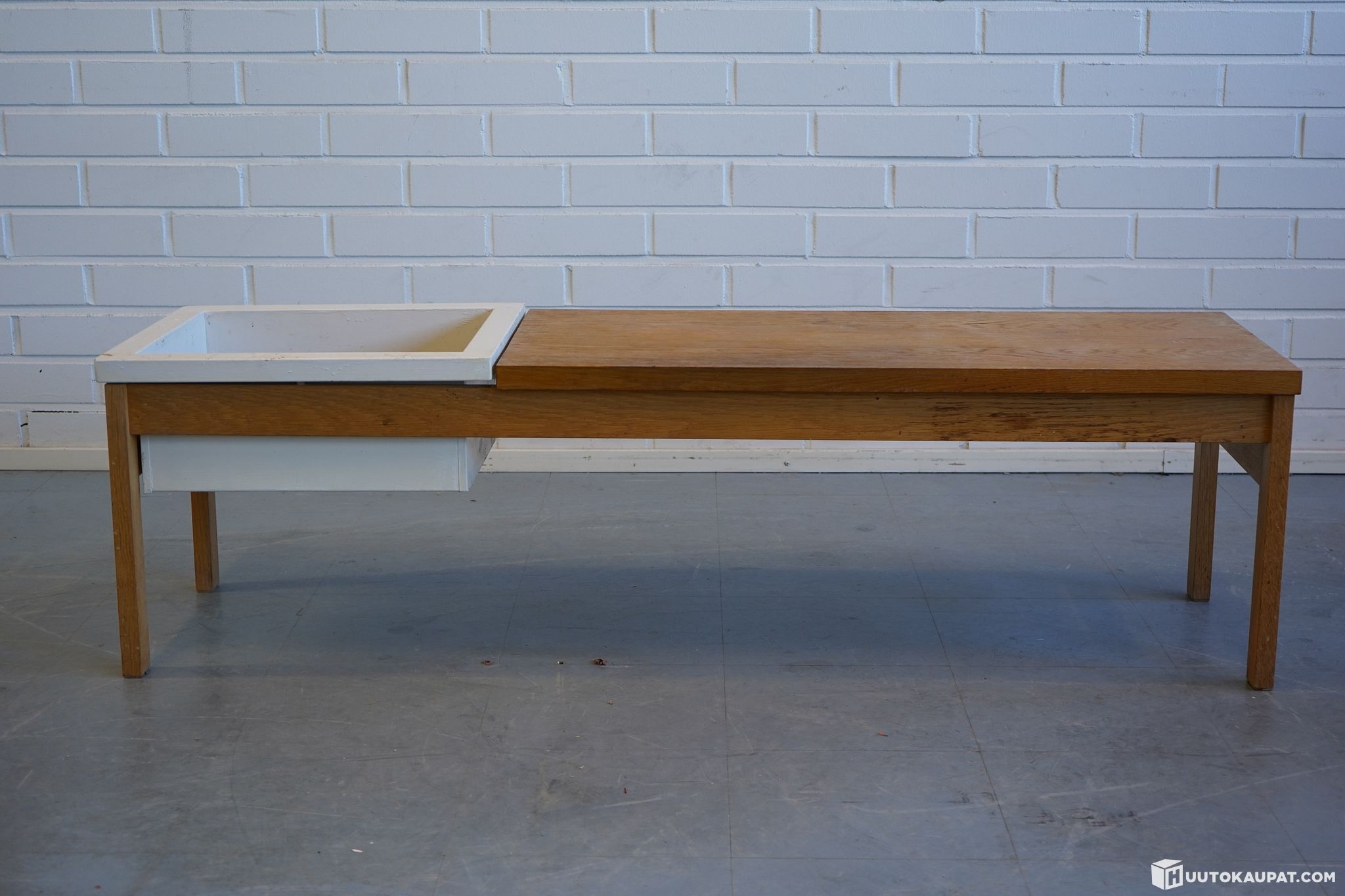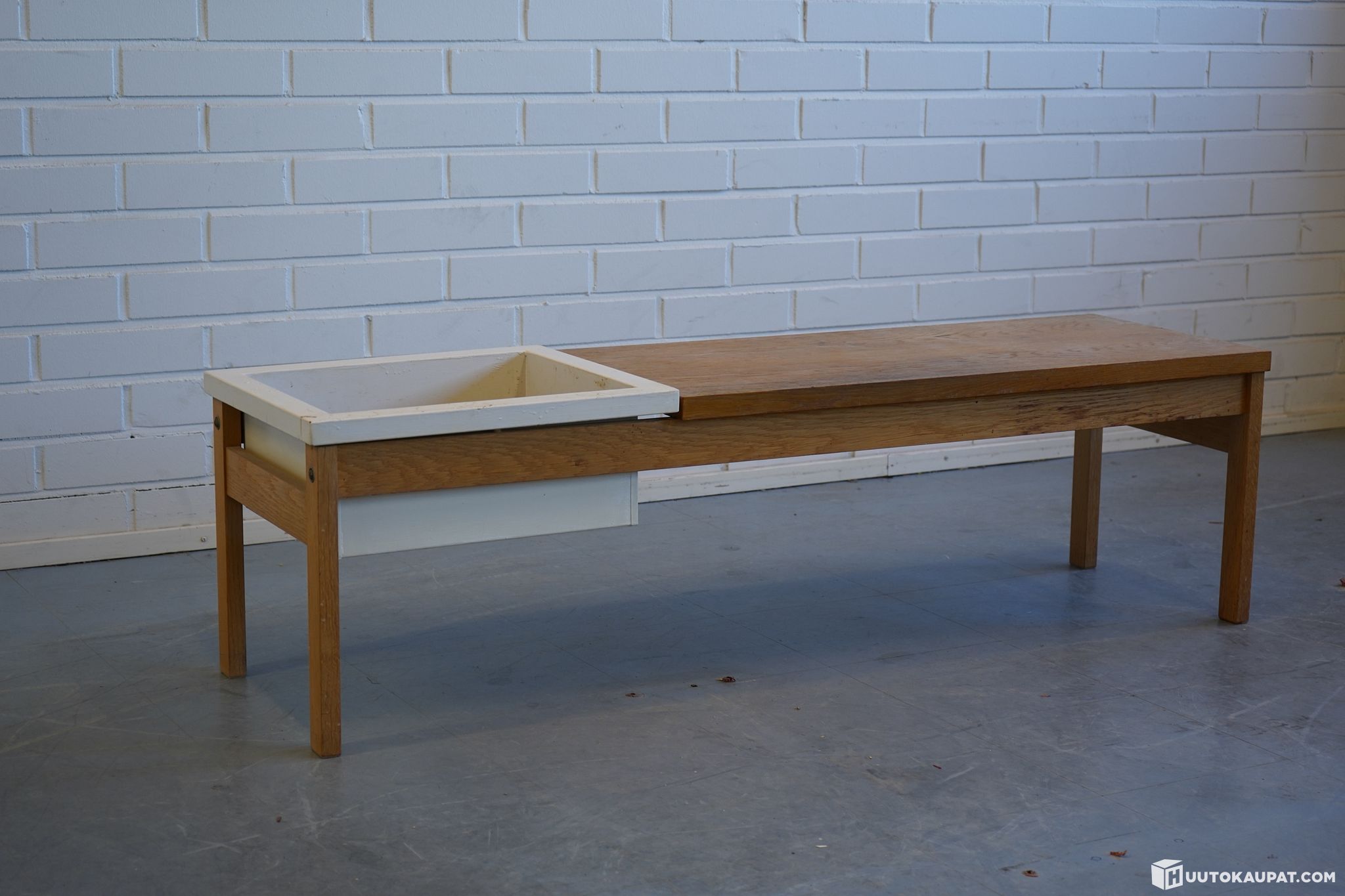 Wooden plant table with a recessed planter at one end. A typical interior element from the 1960s–70s.