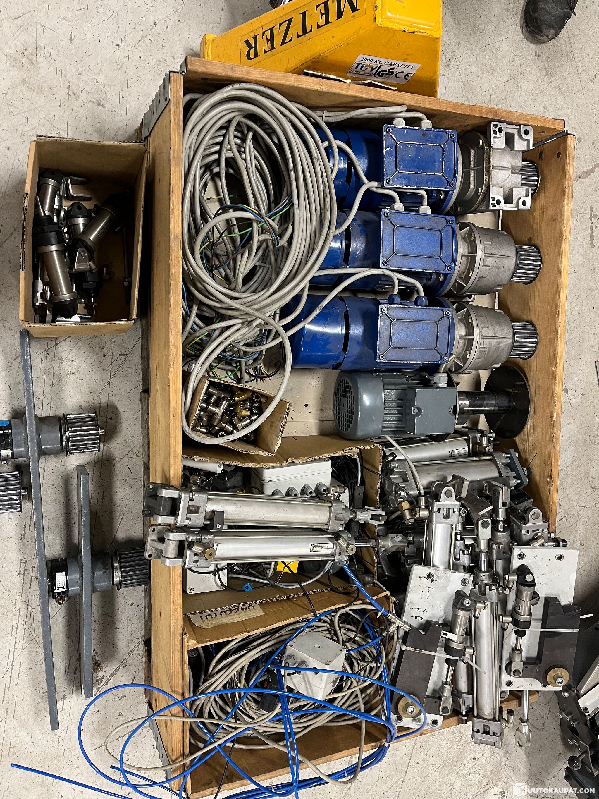 Electric motors and pneumatic cylinders salvaged from use.