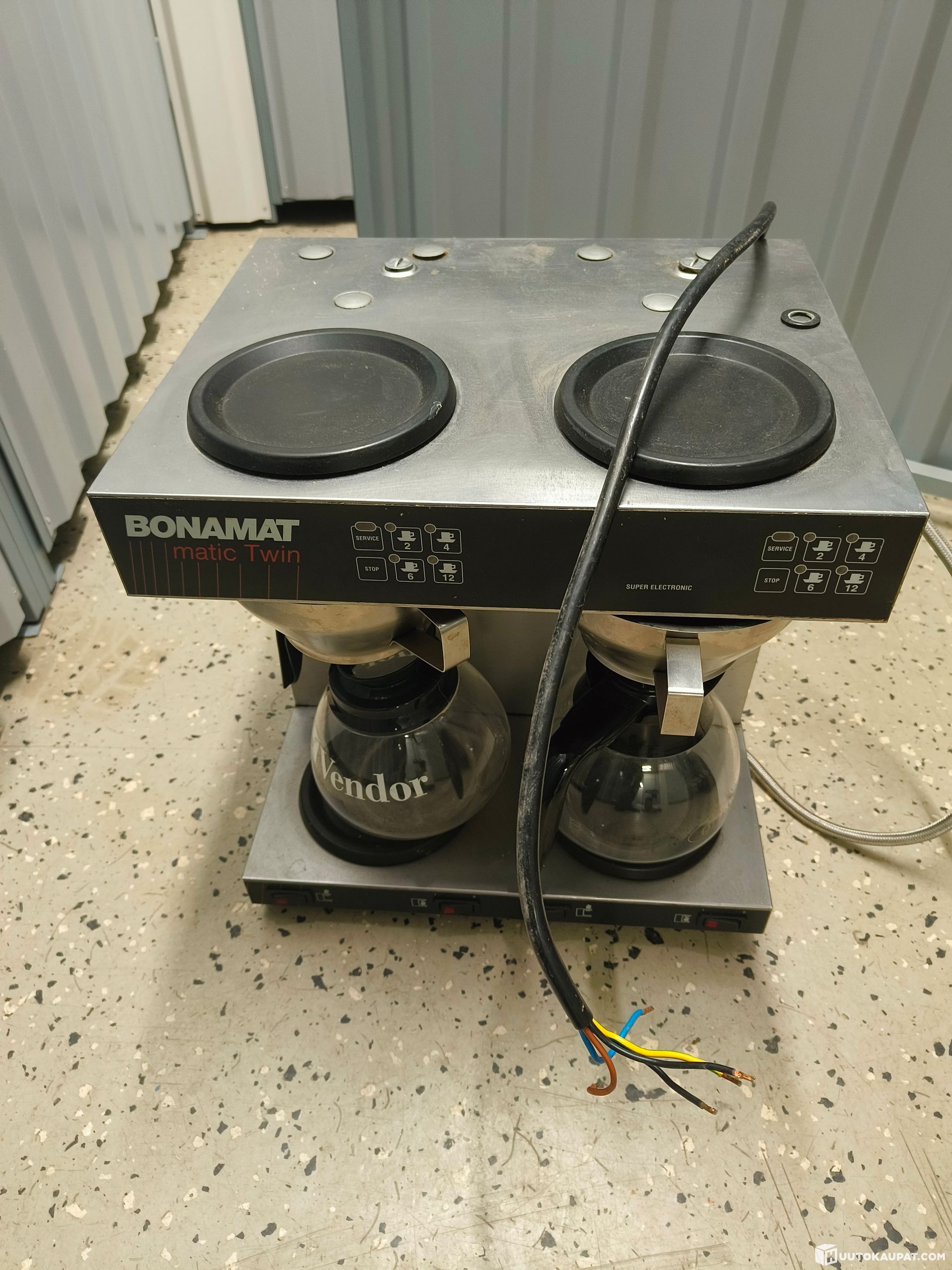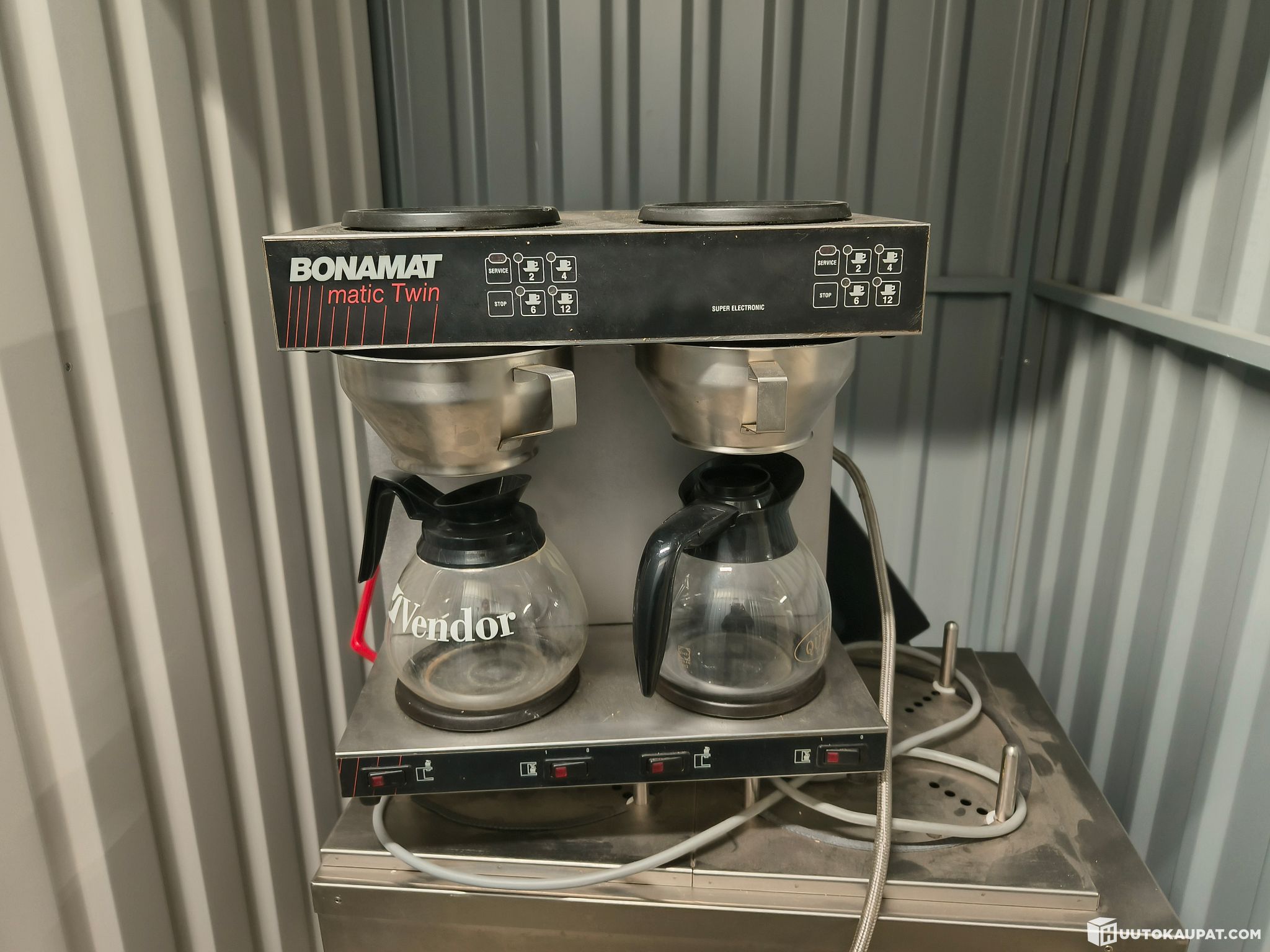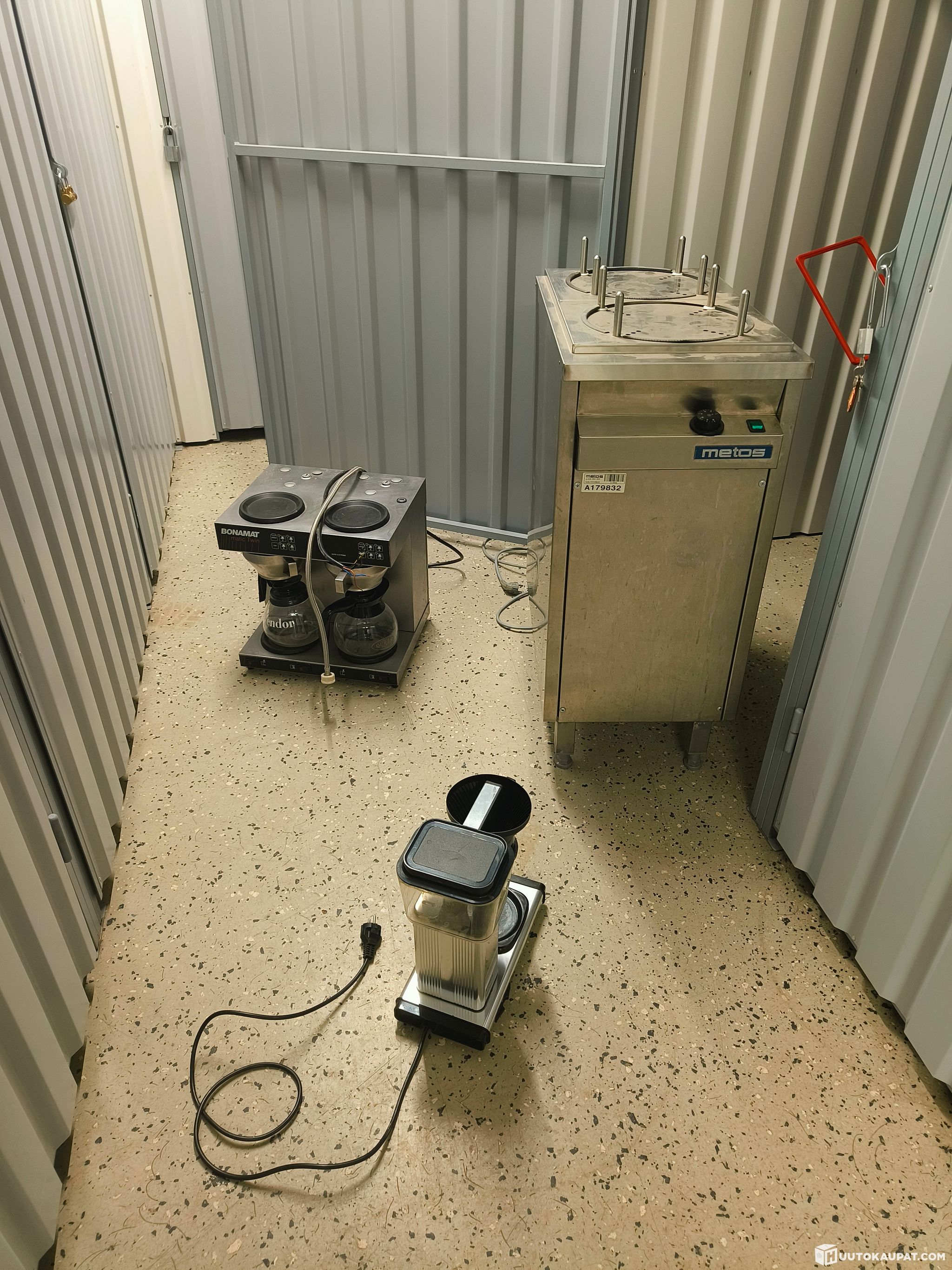 Old equipment from a lunch café. Industrial Bonamat brewer for direct connection to the mains water, a Moccamaster and a Metos 2-tower plate lift with heating.