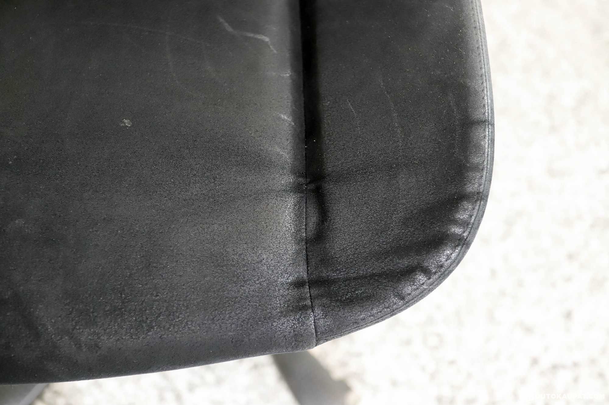 Black, intact upholstery. The upholstery has dirt and signs of use.